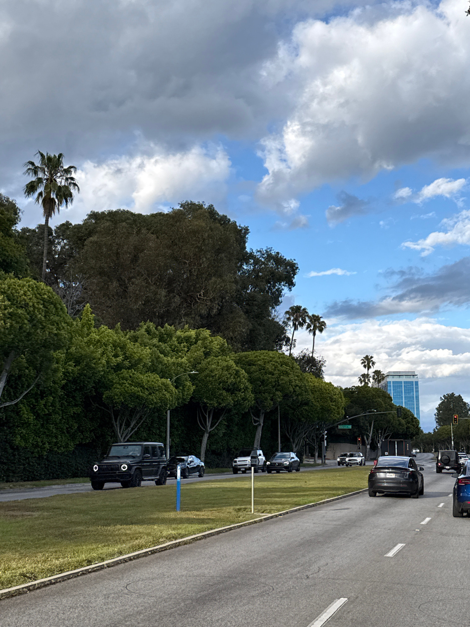 The image depicts a street scene in Beverly Hills, California. A line of black and white Ford Broncos is parked along the grass median between opposing lanes of traffic. The street itself is paved asp…read more
