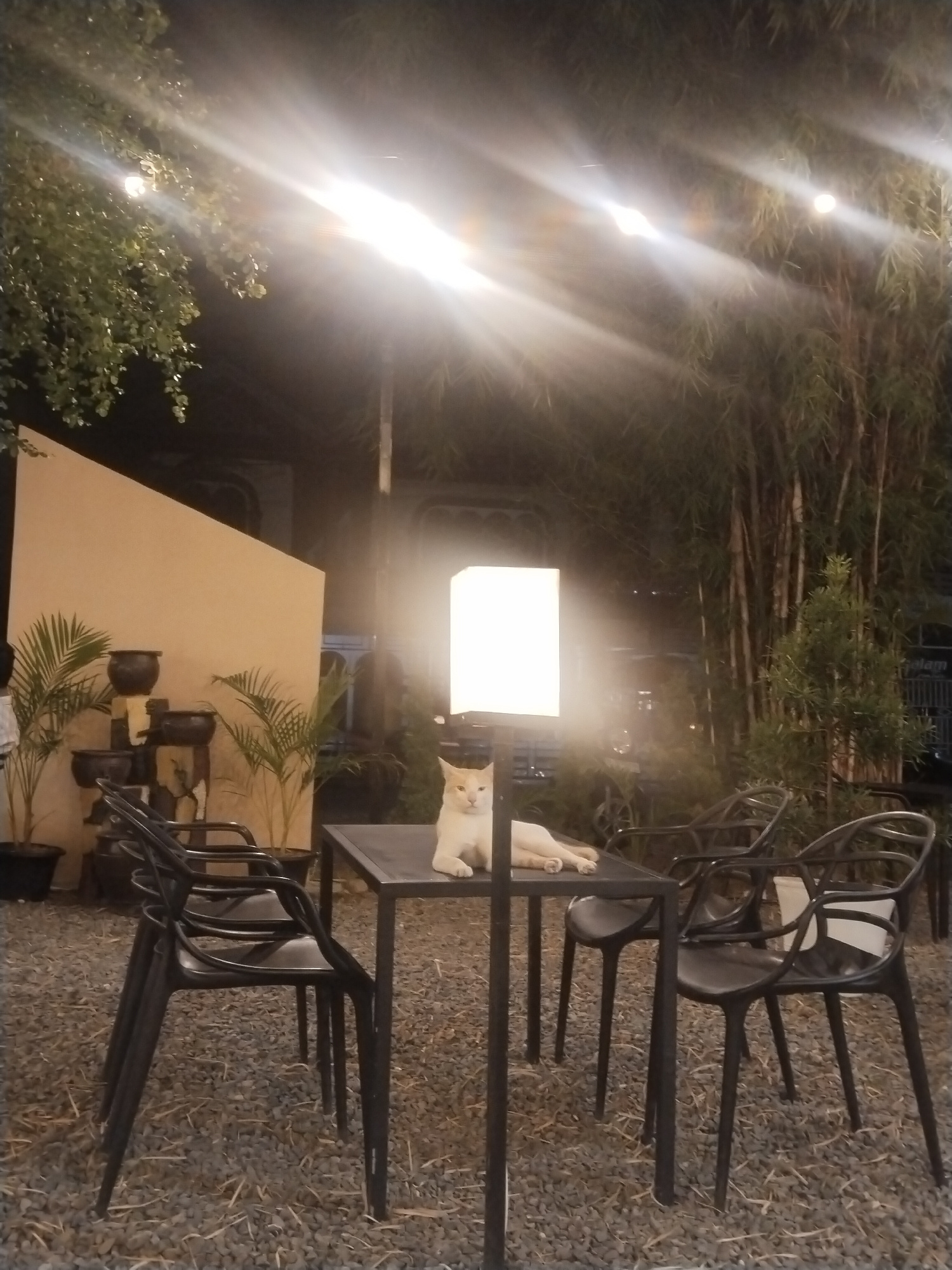 A nighttime scene in Lhokseumawe, Indonesia, depicts an outdoor cafe setting. The ground is covered in small gravel. A black, square table stands center frame with a lamp extending upward from its cen…read more
