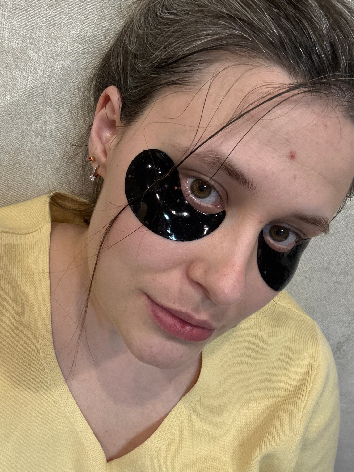 A woman lies on a light grey textured surface, possibly fabric or upholstery, wearing a yellow top. She has black under-eye patches with small star patterns on them. Her hair is greyish-brown and slig…read more