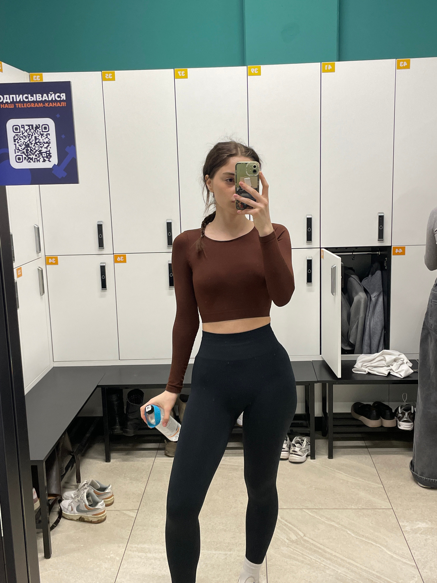 Here is a description of the image: **Scene:** The image captures a young woman taking a selfie in what appears to be a locker room, potentially in a gym or sports facility. **People:** * **Subje…read more