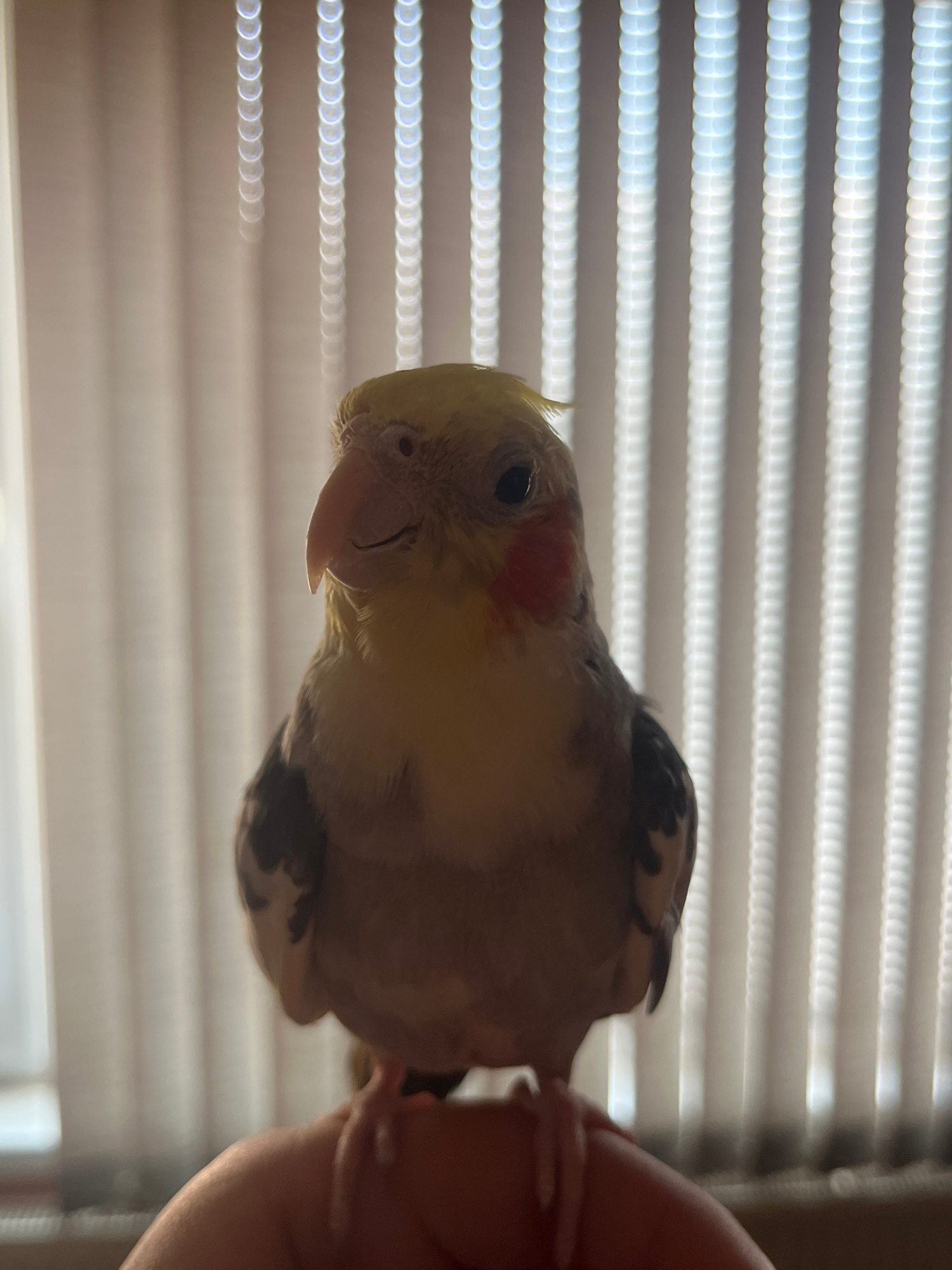A cockatiel is perched on a person's finger. The bird has a yellow face with a red cheek patch, gray wings with black and white markings, and a short crest. The background is a blurred image of window…read more