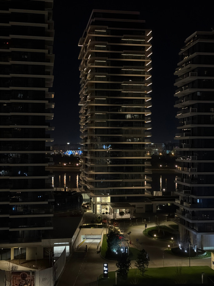 A nighttime shot shows modern buildings with horizontal design elements, illuminated by lights. These structures border a body of water reflecting the cityscape. Adjacent to the buildings is a paved a…read more