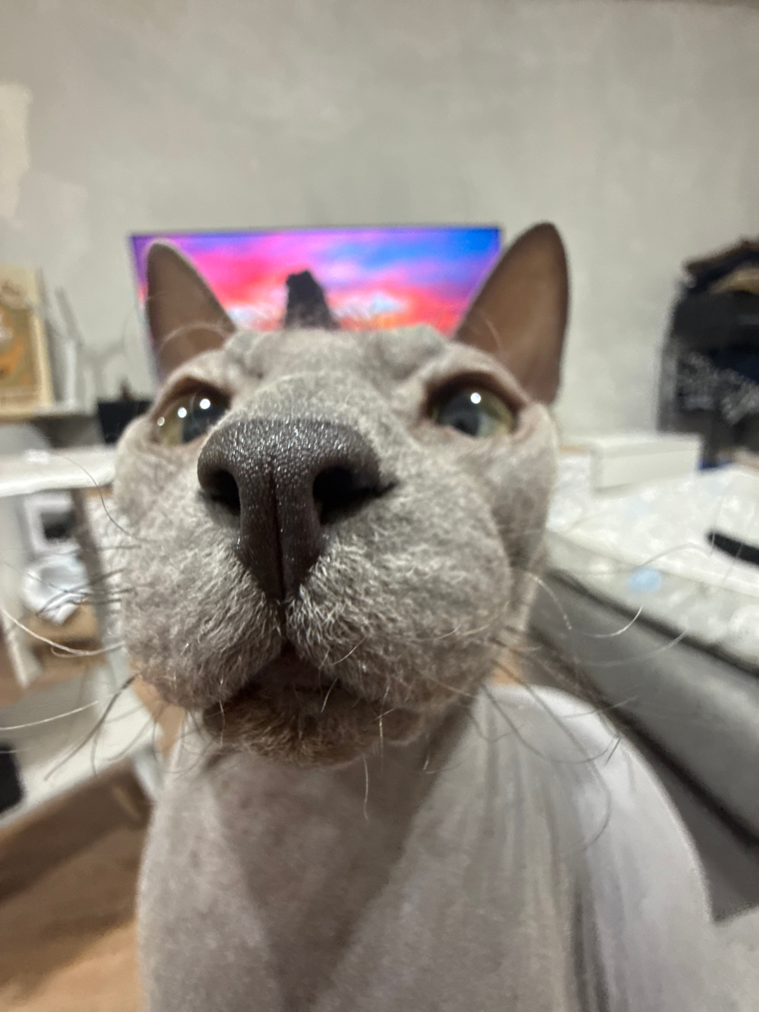 A close-up, vertically oriented photograph captures the head of a grey domestic cat, likely a Sphynx or similar short-haired breed, staring directly at the camera. The cat's large, light-colored eyes…read more