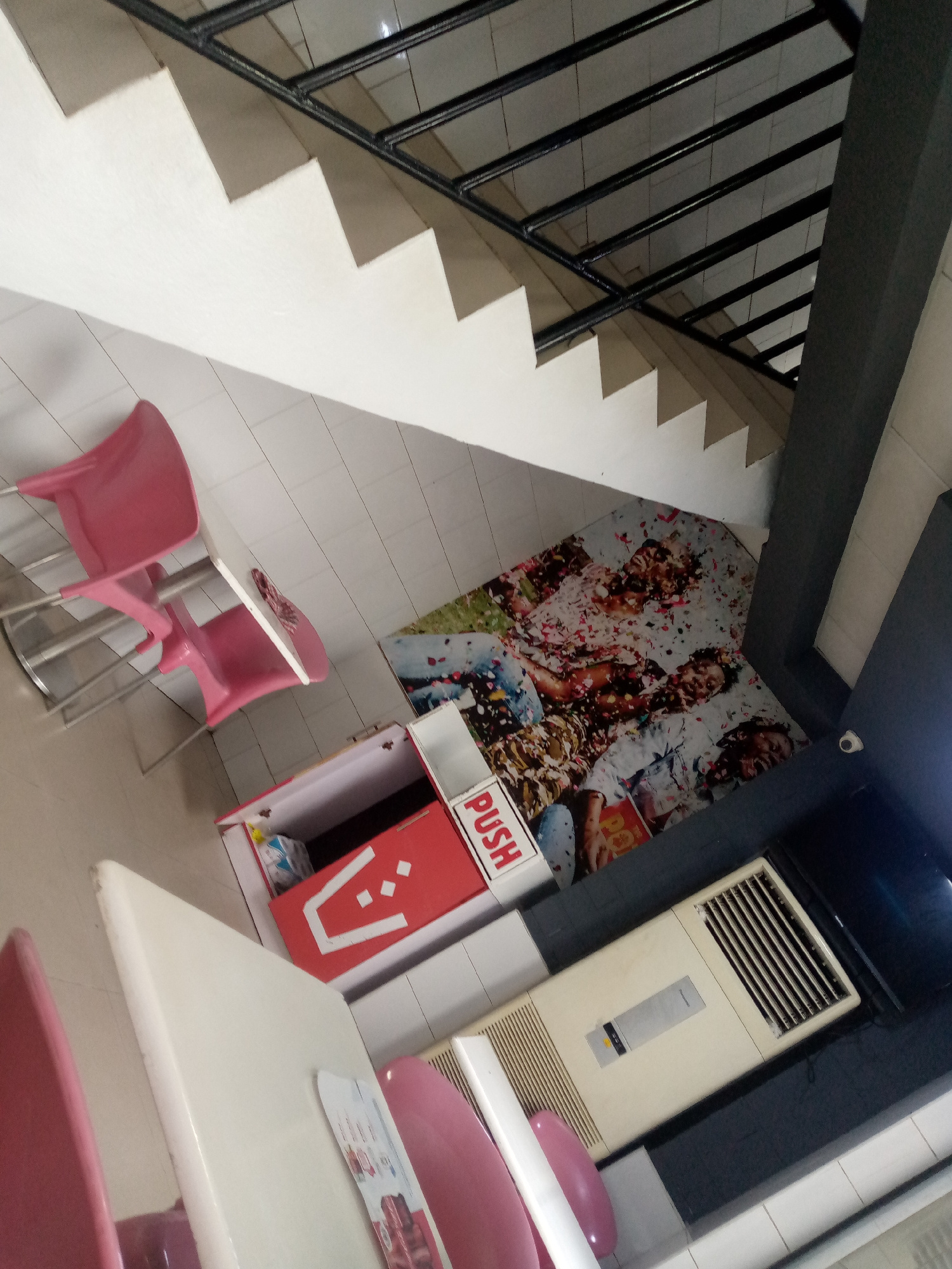 The image shows an interior space in Asaba, Nigeria, featuring a staircase overhead with a metal railing. Below the staircase is a tiled floor with a mural depicting people covered in confetti. Two pi…read more