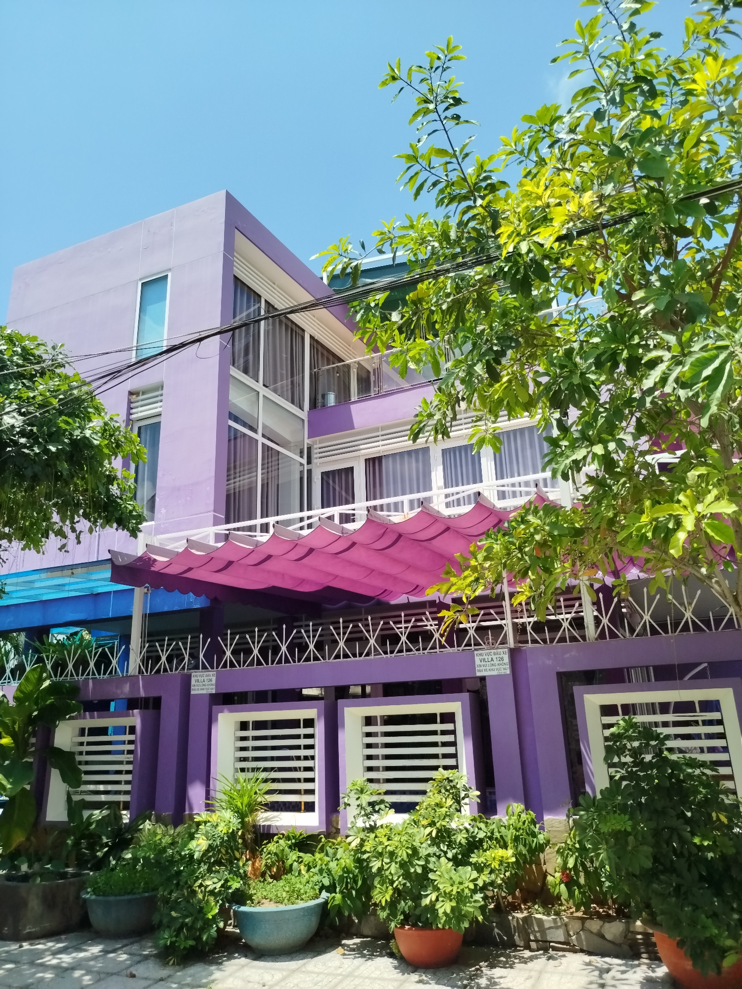 The image shows a three-story building in Ho Chi Minh City, Vietnam. The building is painted a lavender color with white accents around the windows and balcony railings. The building has a modern desi…read more