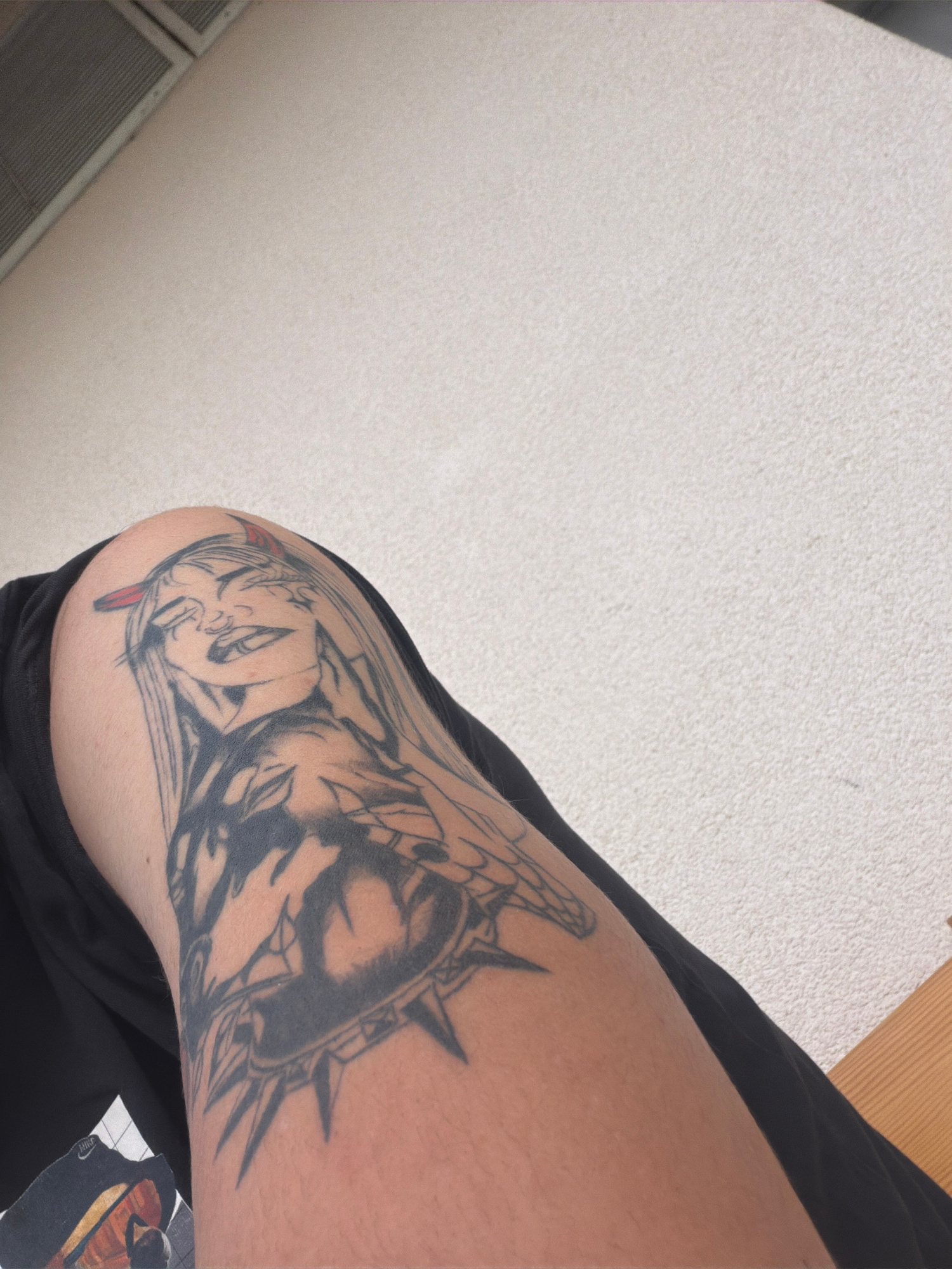 The image shows a person's arm with a tattoo. The tattoo appears to depict a figure wearing a crown of thorns, possibly a religious or symbolic image. The person is wearing a black garment. The backgr…read more