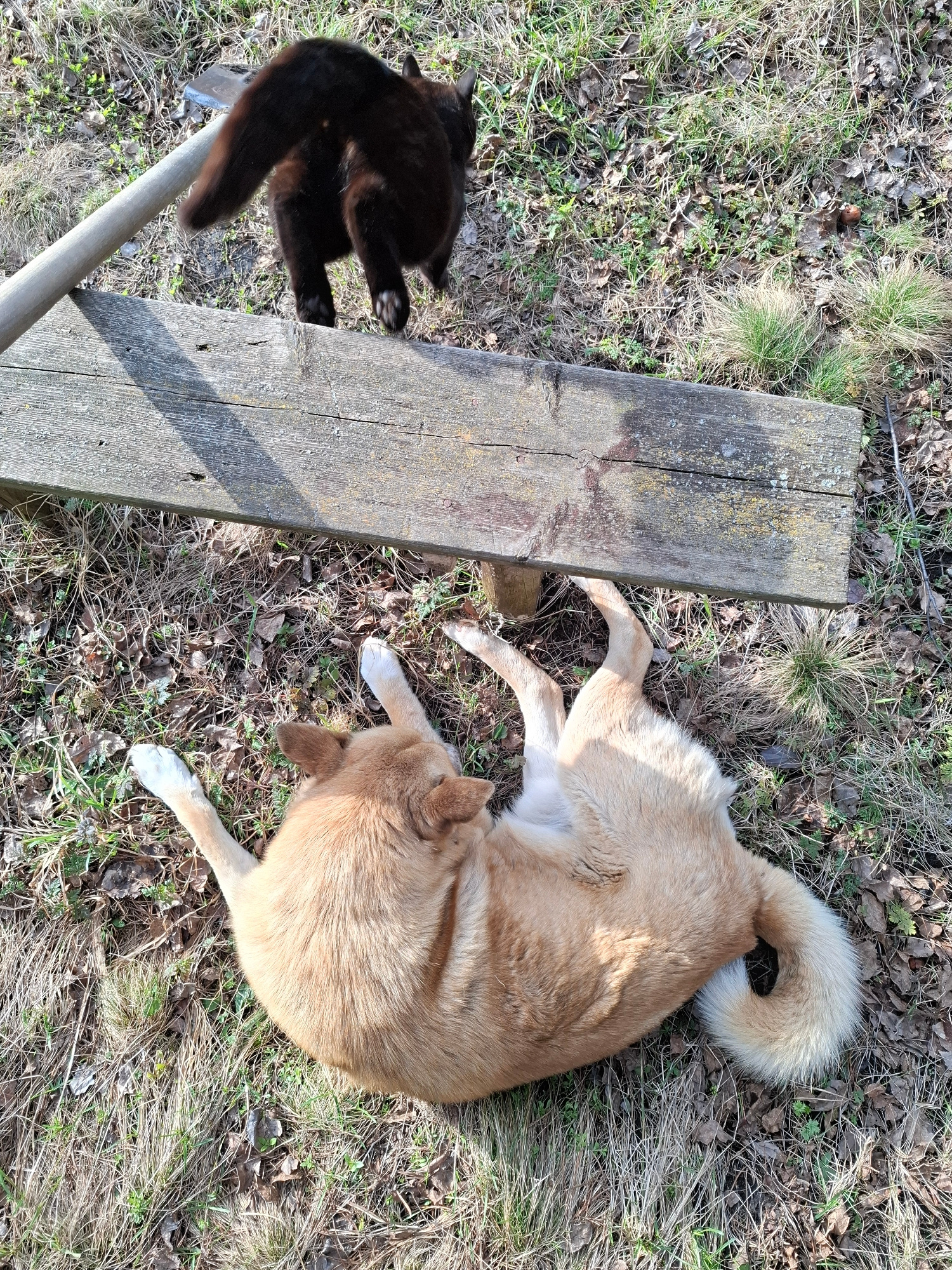 A black cat lies on a weathered wooden plank next to a light-brown dog lying on the ground amidst grass and dead leaves. The scene takes place outdoors under natural lighting conditions. The location…read more
