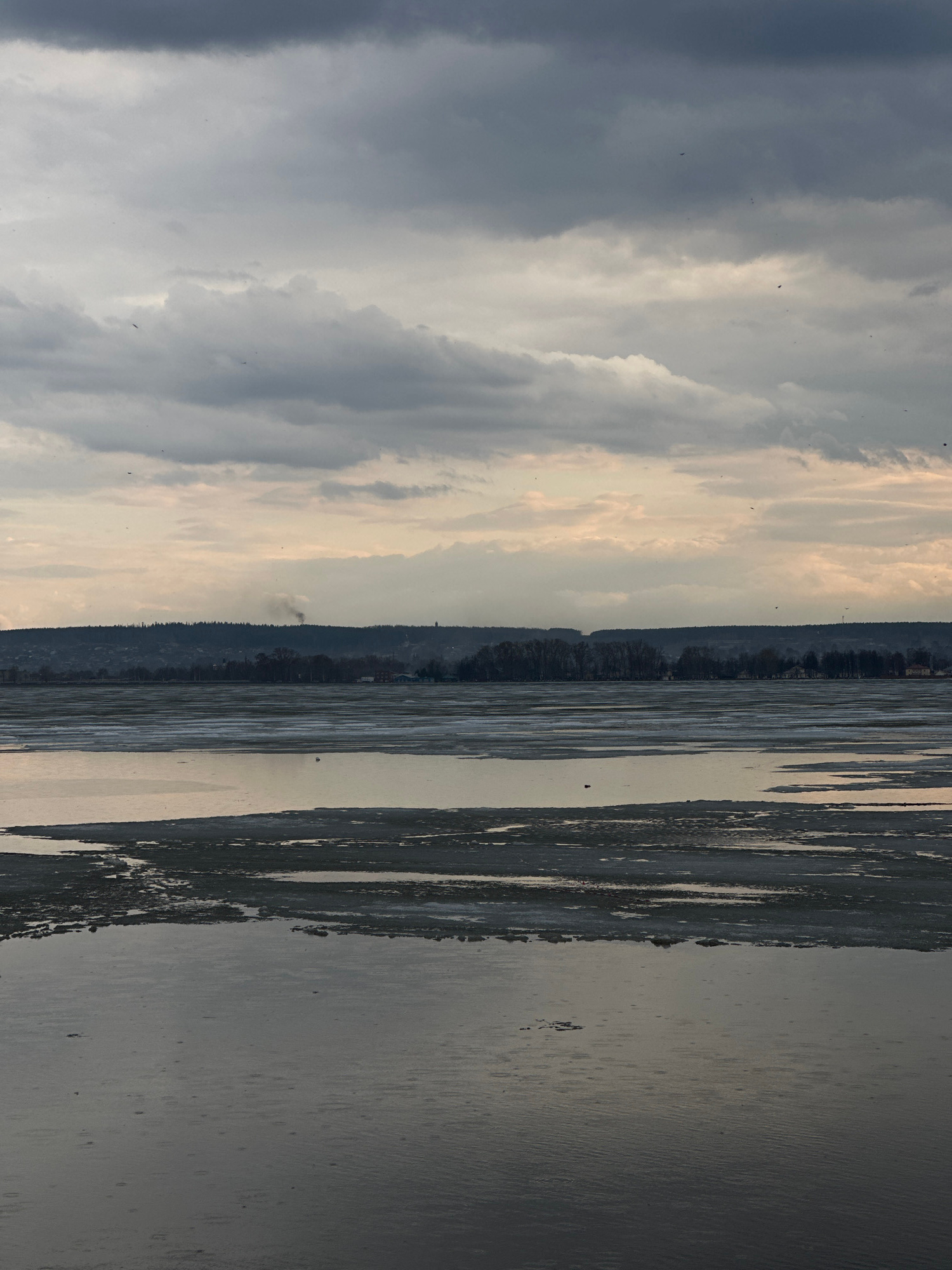 The image depicts a landscape in Votkinsk, Russia. The sky is filled with grey and white clouds. The horizon line shows a dense treeline. A body of water, likely the Votkinsk Reservoir, extends into t…read more