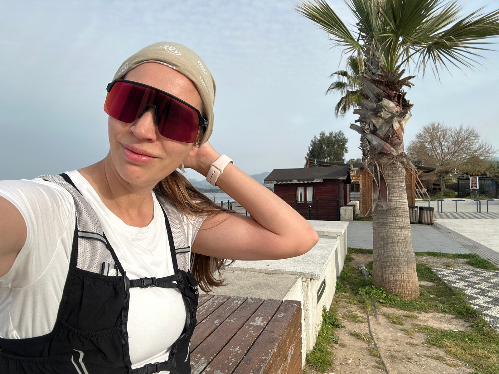 A woman wearing a white athletic top with a black hydration pack, a beige headband, and red sunglasses stands next to a palm tree. The location is Fethiye, Turkey, recognizable by the coastal architec…read more