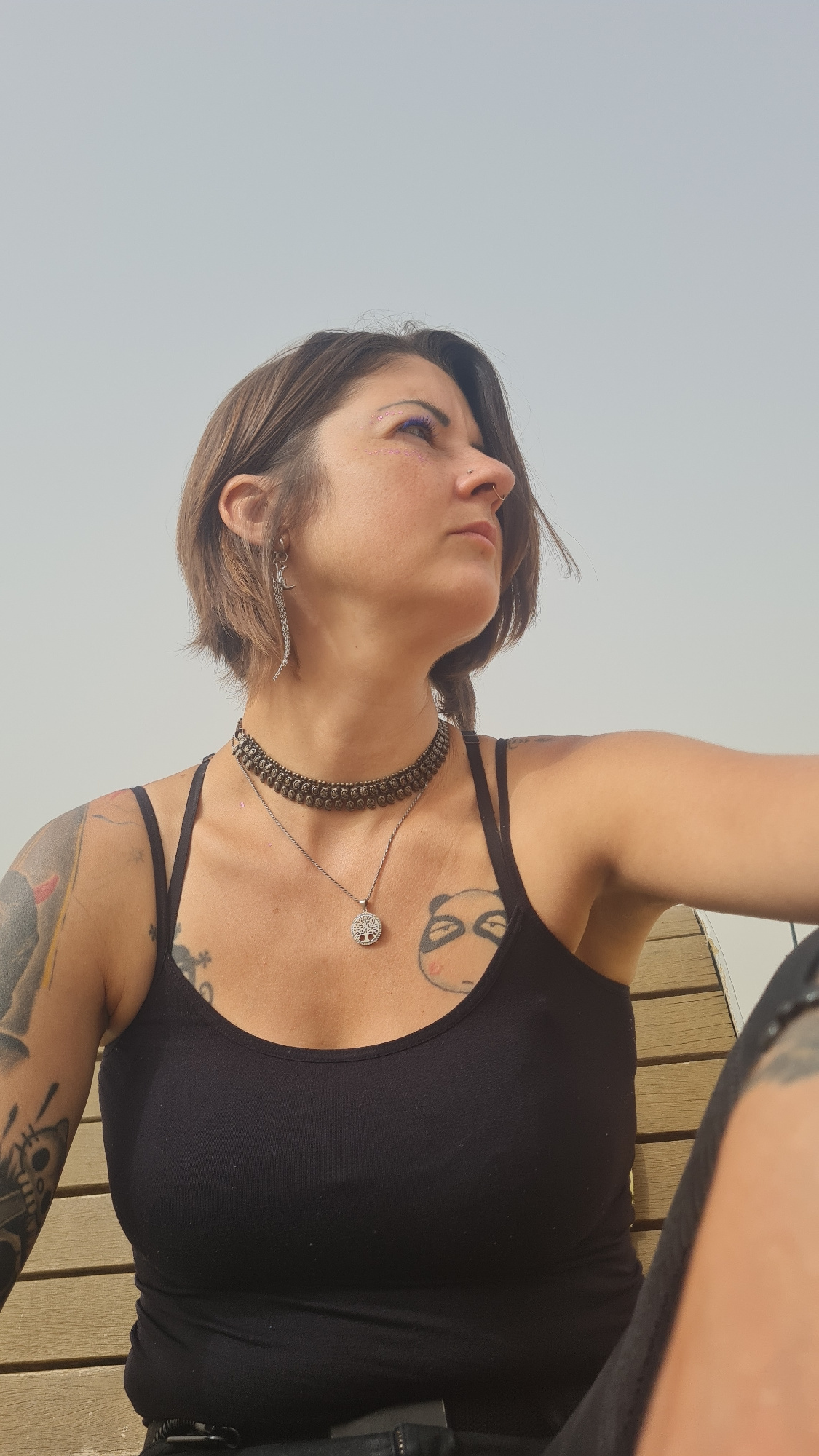 A medium shot of a woman with fair skin and short brown hair in Nahariyya, Israel, angled from below against a clear sky. The woman is wearing a black tank top, a thick beaded necklace, and a long, th…read more