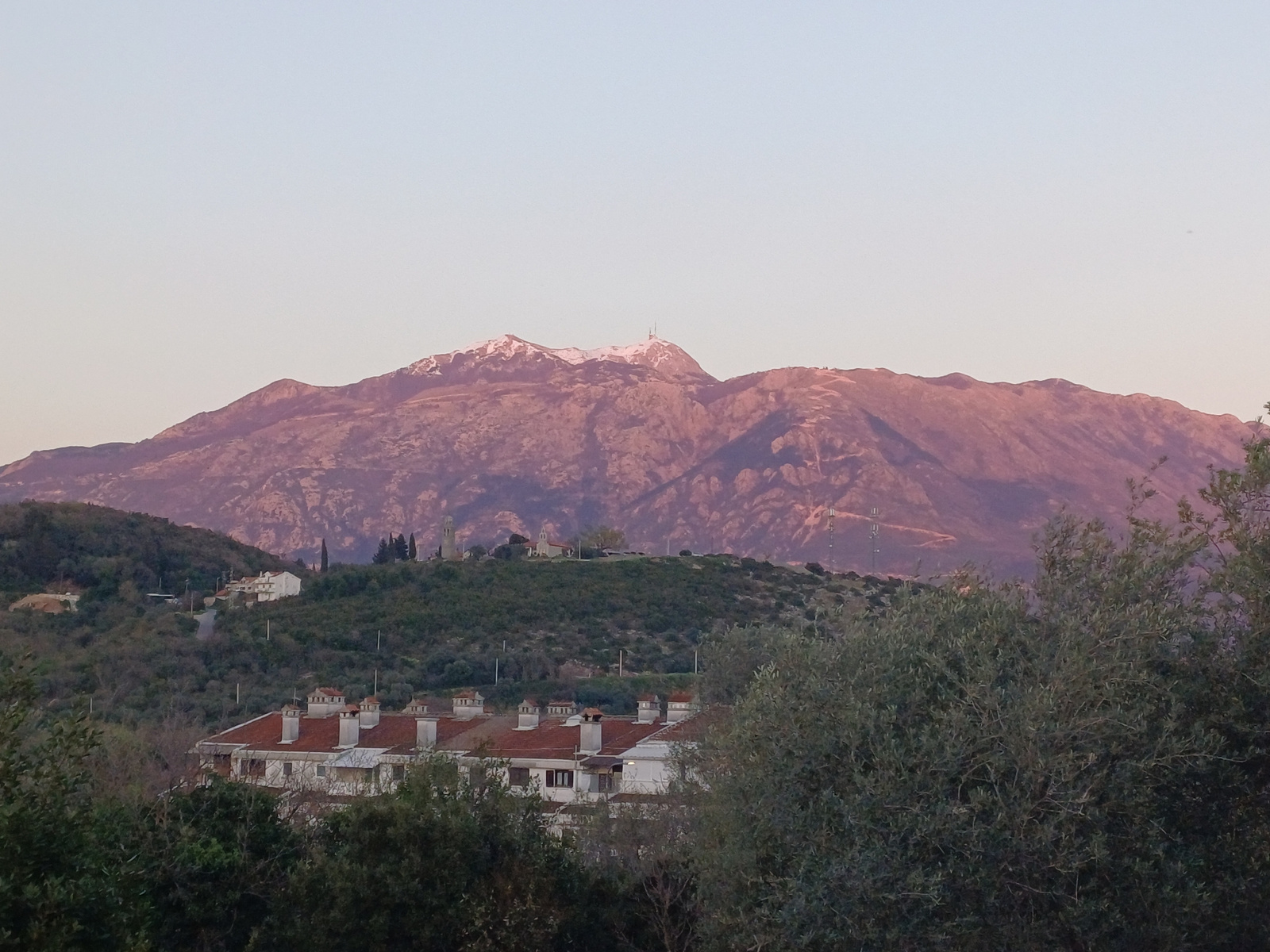 The image presents a view in Radovići, Montenegro. In the foreground, there are trees and a building with a red-tiled roof and white chimneys. A low, green hill rises behind the building, dotted with structures, including a white building, a slender tower, and what seems to be a smaller church. In the background, a large mountain range is visible, with some snow on its peaks and a telecommunication tower on the highest point. The sky is a pale blue. | Open Wire