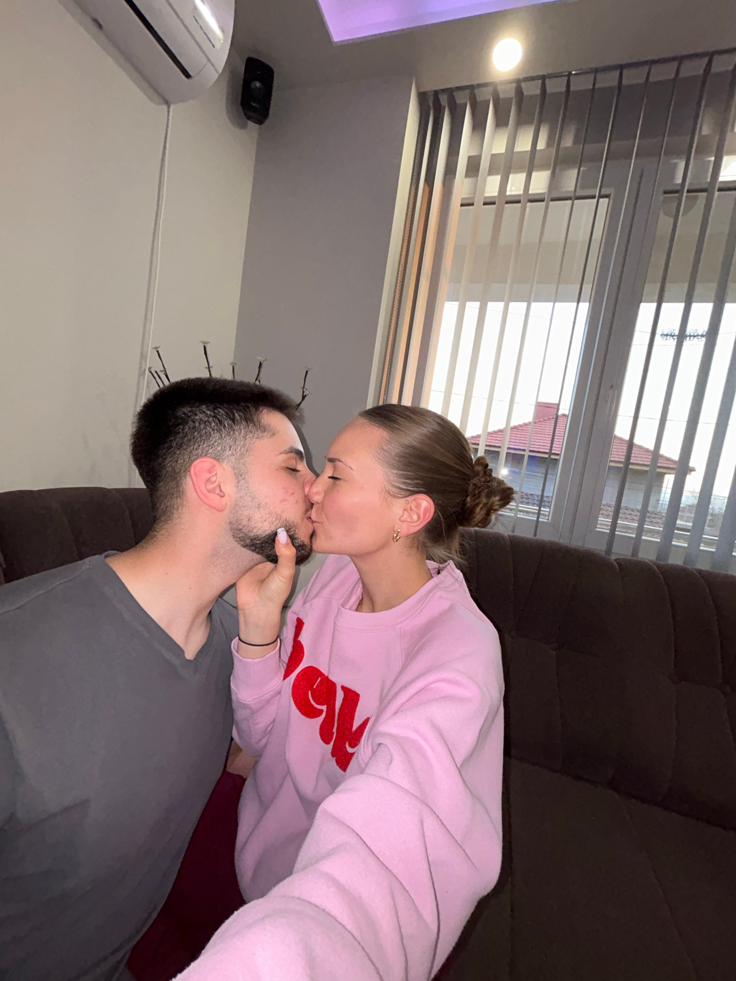A woman with her hair in a bun, wearing a pink sweater with red lettering, kisses a man with a beard and dark hair. The man is wearing a gray shirt. They are indoors, possibly on a brown couch. A wind…read more