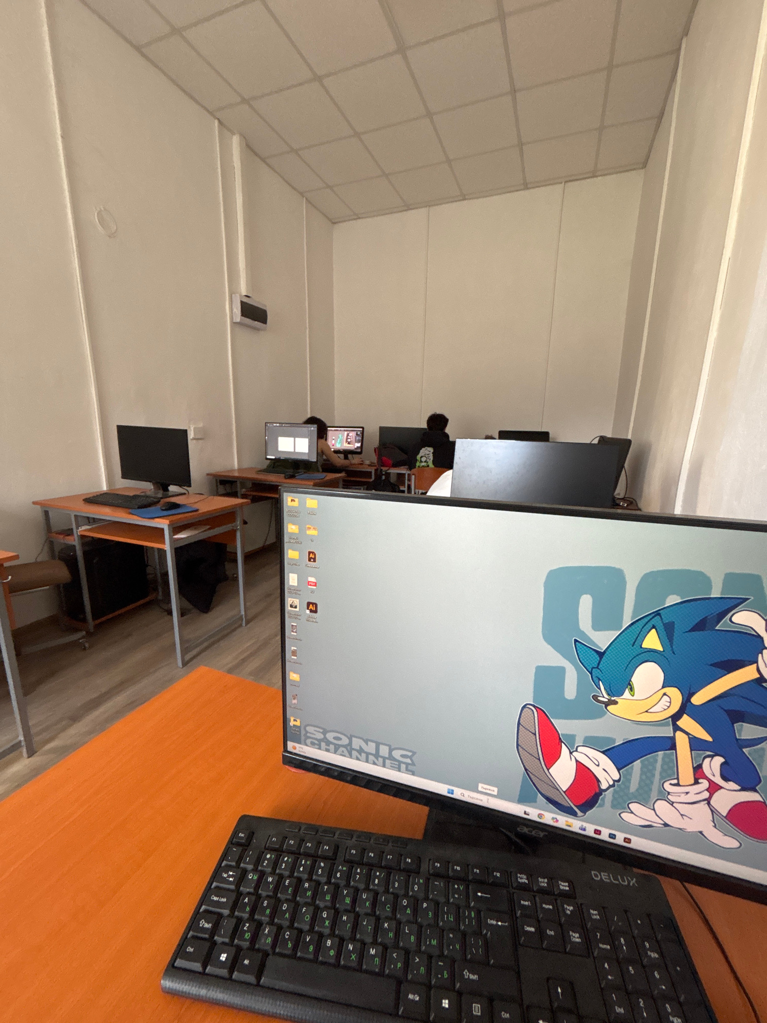 This image, rotated clockwise, depicts an indoor computer lab or classroom in Troyan, Bulgaria. In the foreground, a computer monitor displays a vibrant Sonic the Hedgehog wallpaper, with the characte…read more
