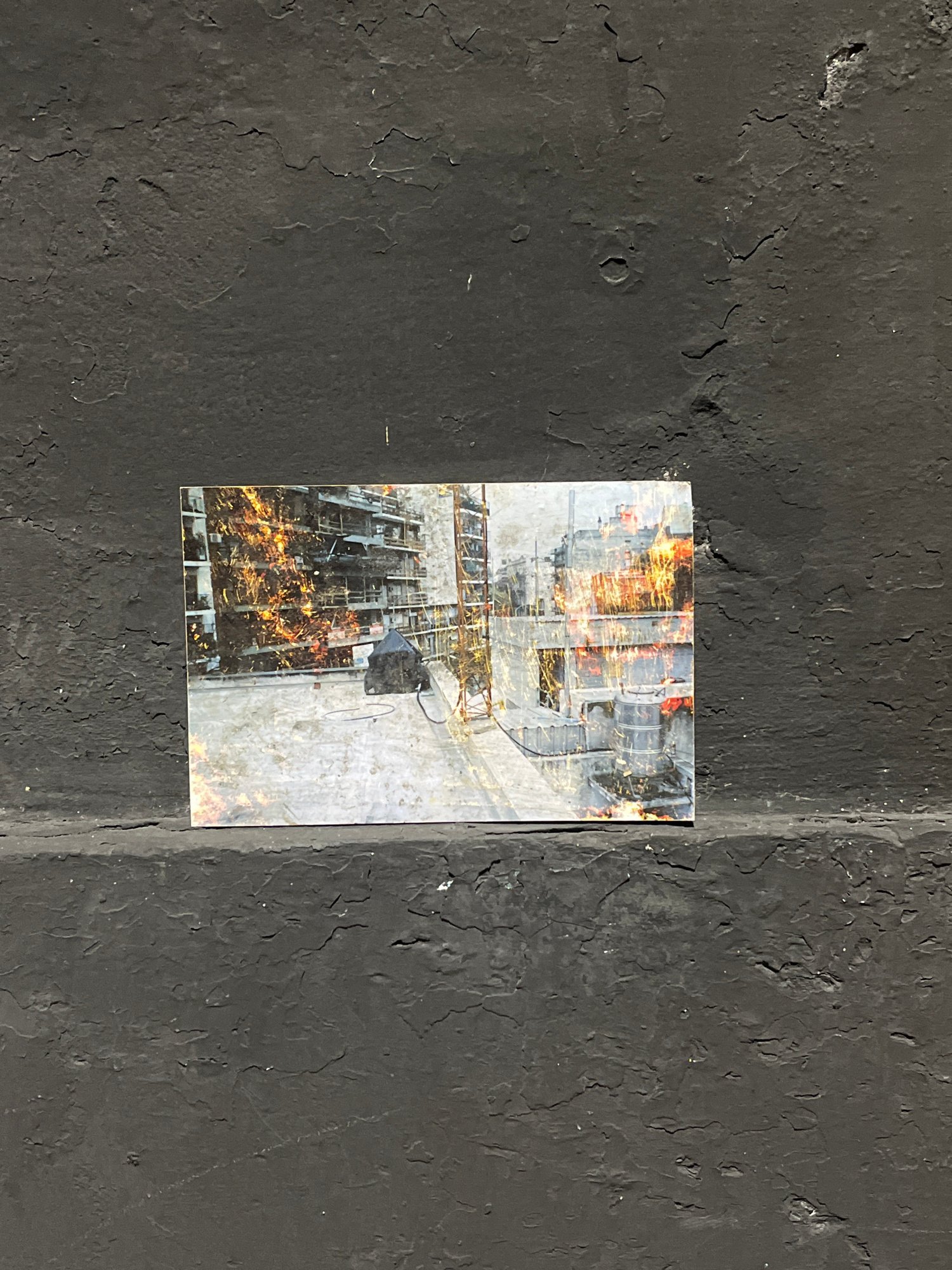 A rectangular, glossy photograph is adhered to a rough, dark gray, possibly concrete or stucco, surface. The photograph depicts an abstract or distorted image, possibly of a building under constructio…read more