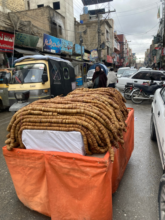 A street scene in Quetta City Tehsil, Pakistan, depicts a large quantity of dried figs, strung into numerous golden-brown ropes, displayed on an orange-tarped vendor cart occupying the lower portion o…read more