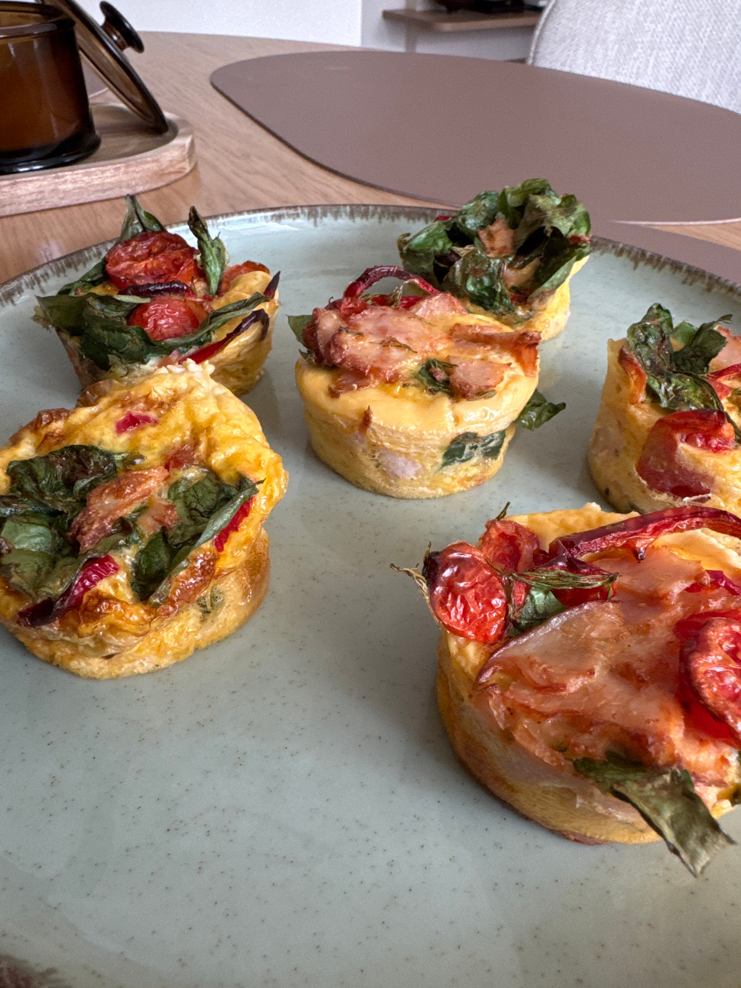The image shows a plate with several egg muffins, topped with spinach, tomatoes, and bacon. The plate is light blue with darker speckles. Part of a table and a lamp can be seen in the background. The…read more