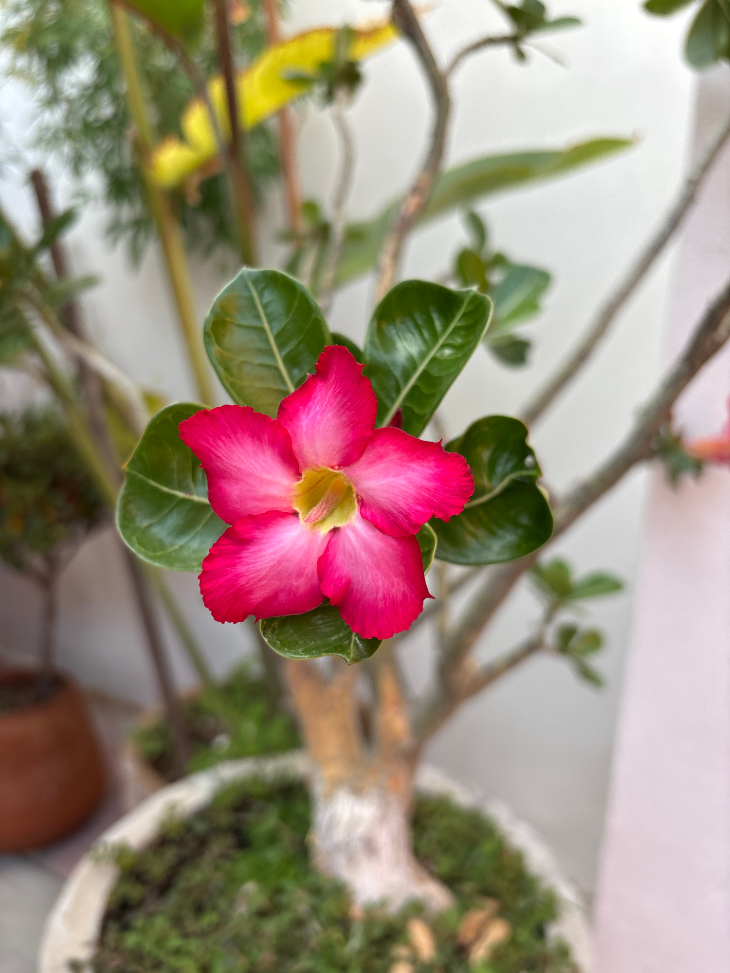 Close-up shot of a pink desert rose flower, featuring five petals with a magenta border and lighter pink towards the center with yellow stamen. The flower is surrounded by glossy green leaves. The pla…read more