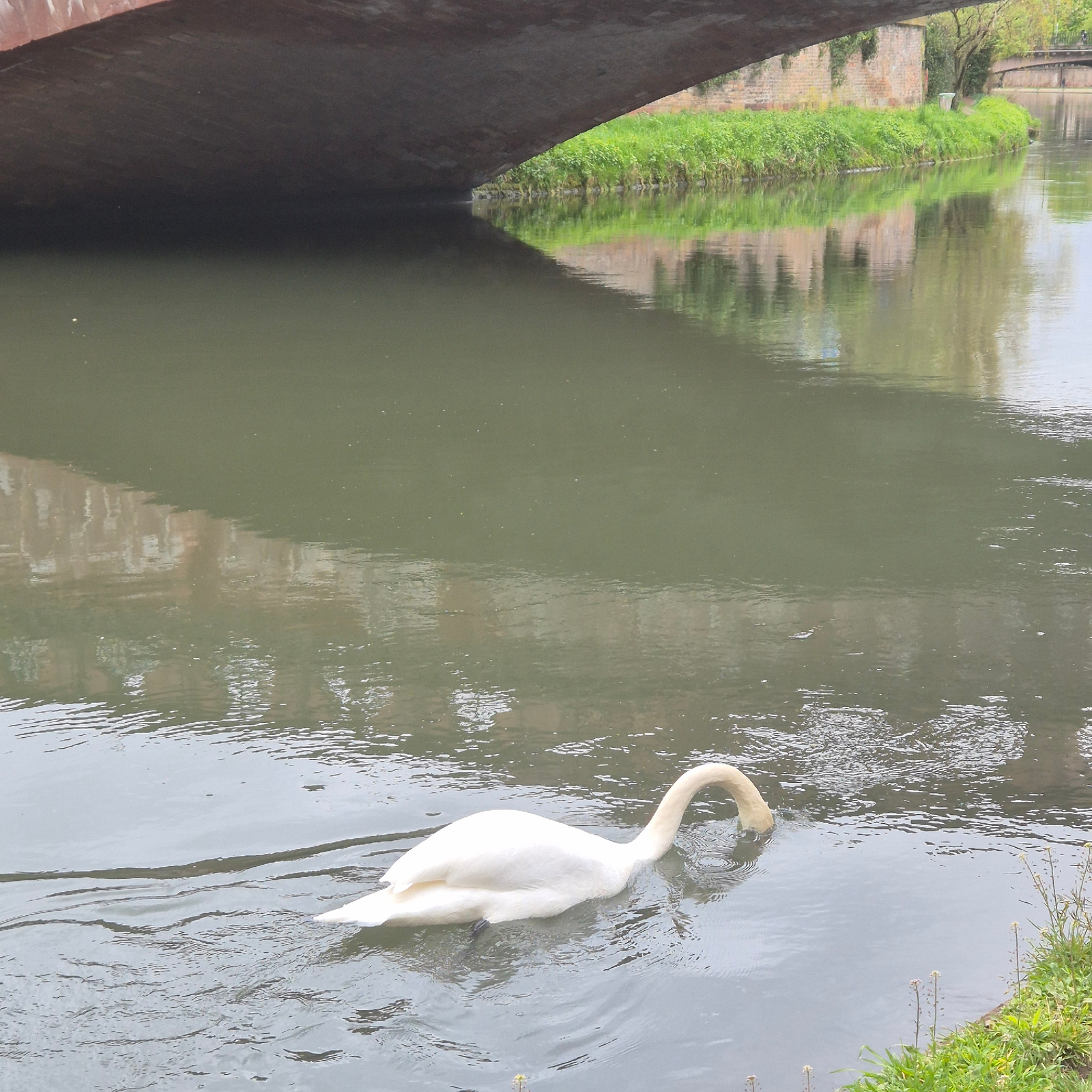 The image captures a scene on the Canal de la Marne au Rhin in Strasbourg, France. A white swan swims in the canal, its reflection subtly distorting on the water's surface. The canal is bordered by a…read more