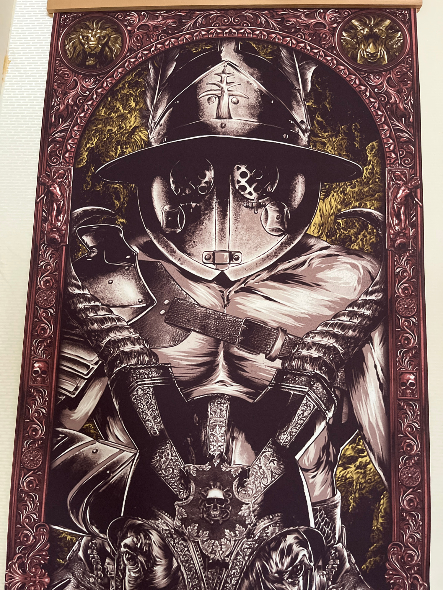 An ornate, highly detailed illustration depicts a heavily armored figure, possibly a warrior or knight, set within an elaborate decorative frame. The main subject is centered and shown from the waist…read more