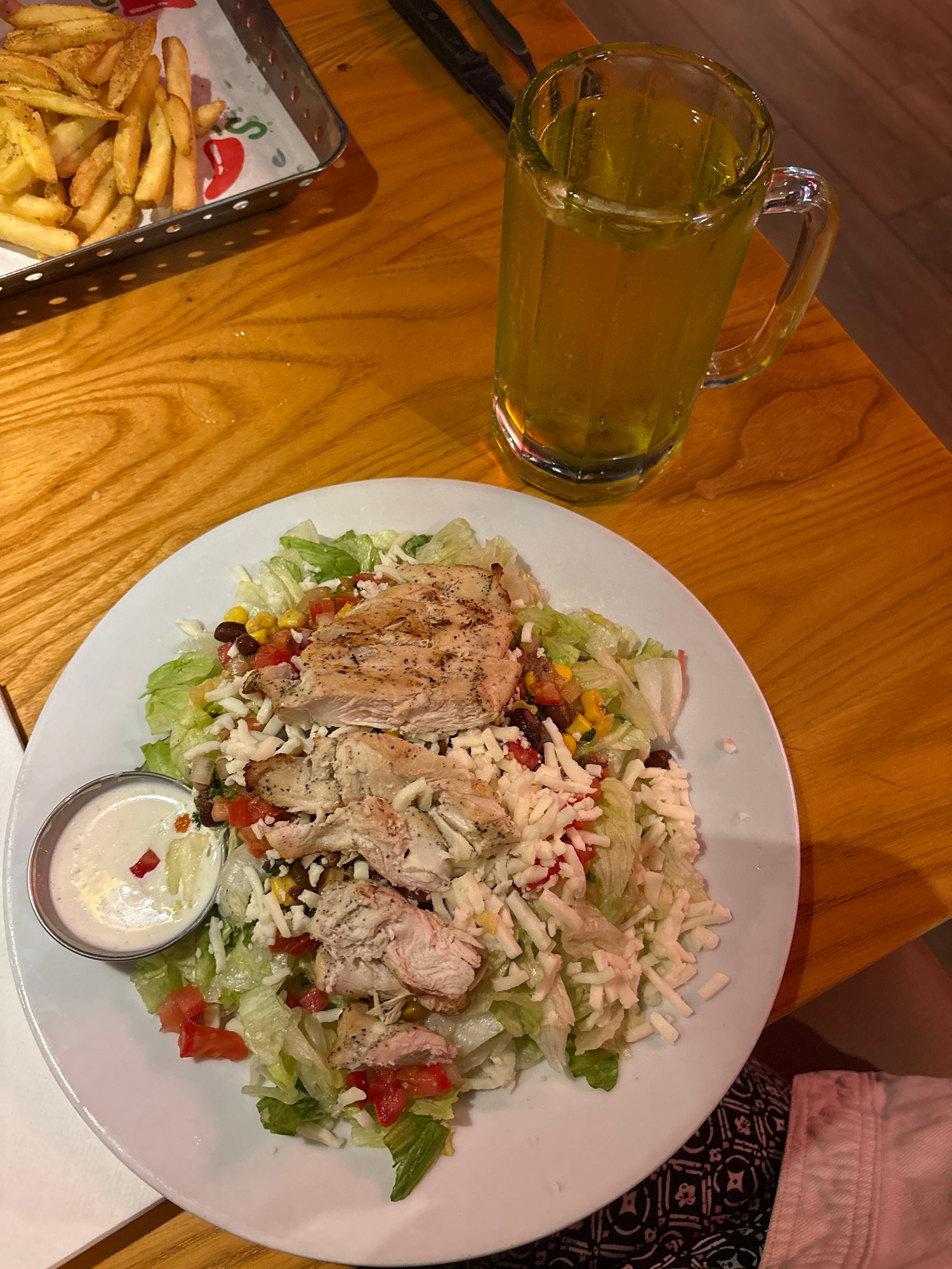 A top-down shot shows a wooden table at a restaurant. A large, clear glass mug filled with amber liquid sits on the table. Beside it is a white plate containing a salad with grilled chicken, lettuce,…read more