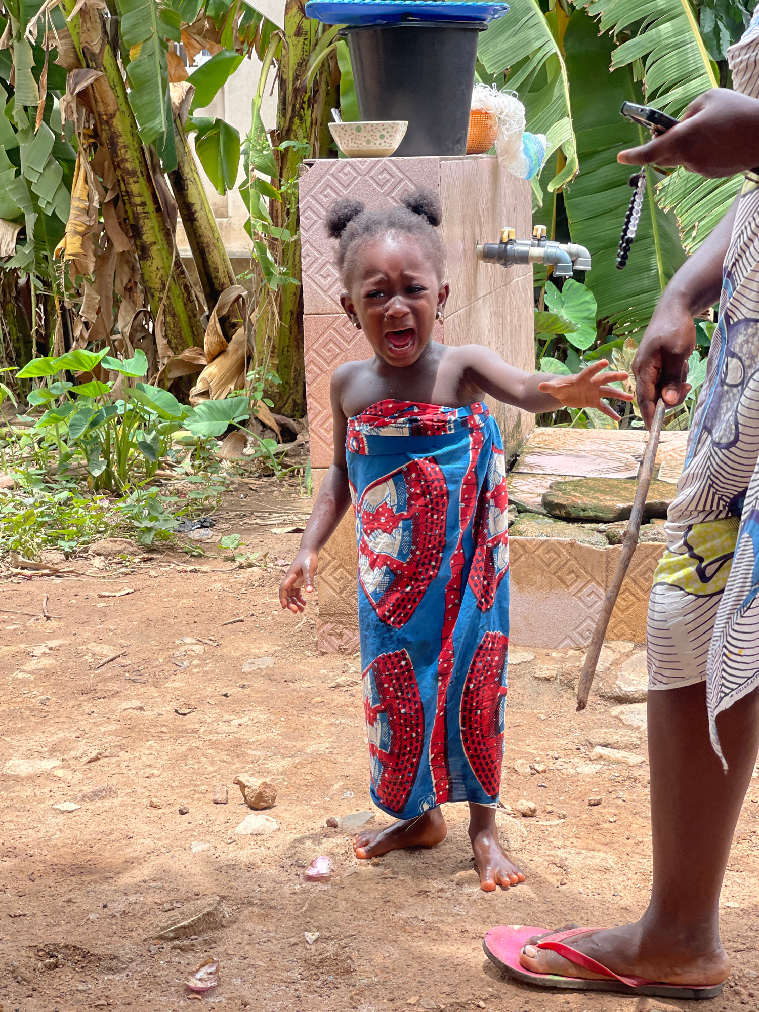 A young child stands on a dirt surface outdoors, partially wrapped in a colorful cloth, seemingly distressed with mouth open in a cry. An adult figure stands beside the child, holding a small stick or…read more