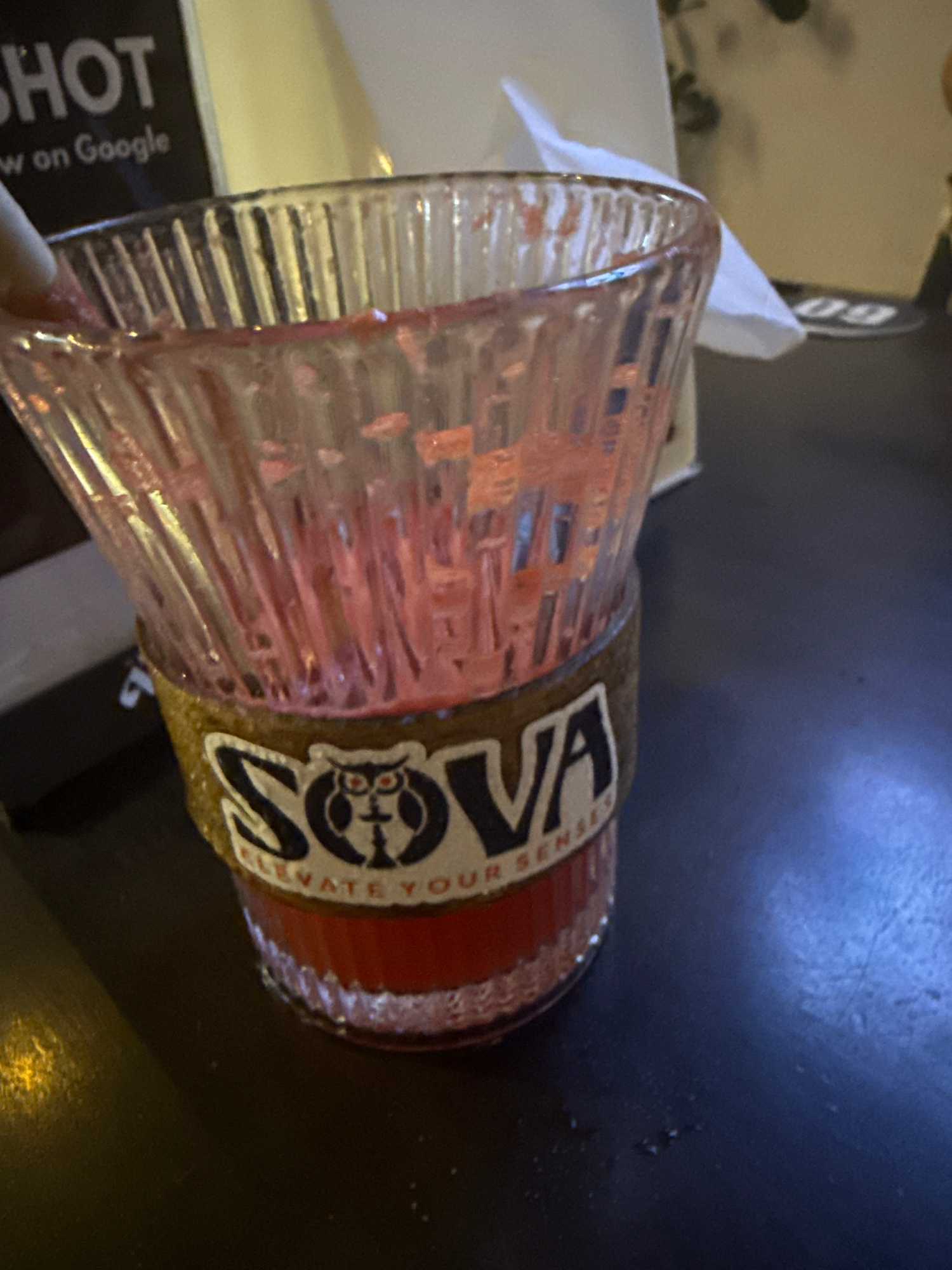 A glass cup with ridges and a label that reads "SOVA ELEVATE YOUR SENSES" sits on a dark surface. The cup appears to contain a reddish liquid. The location, city of Đà Nẵng, Vietnam, cannot be determi…read more