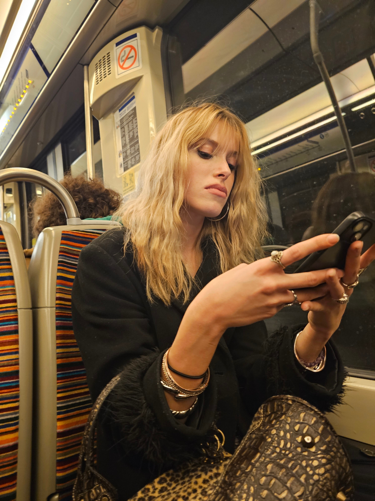 A blonde woman, wearing several rings on her fingers and bracelets on her wrist, is using a smartphone in an urban transportation setting, likely the Paris Metro. She is seated in a train car with mul…read more