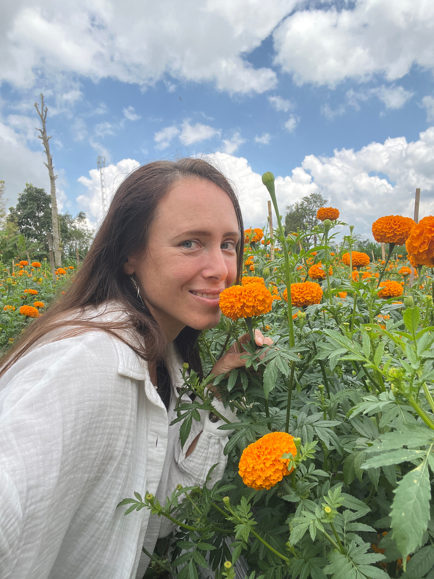 A woman is standing in a field of orange marigold flowers in Kintamani, Indonesia. The woman has long brown hair and is wearing a white shirt. She is holding a marigold flower near her face and smilin…read more