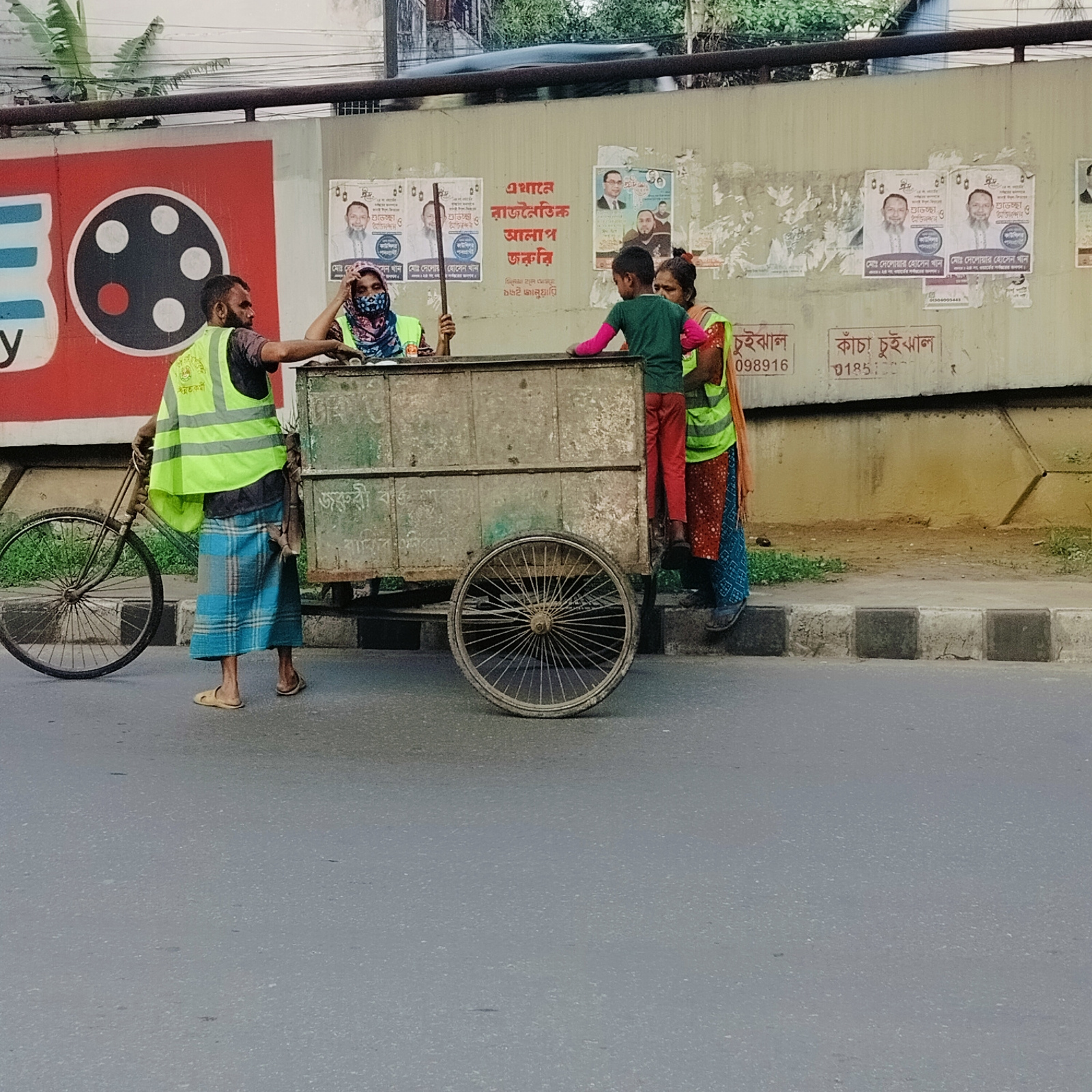 The image shows a street scene in Dhaka, Bangladesh. Three adults and one child are gathered around a large, wheeled metal cart. A man stands next to the cart holding a bicycle. He is wearing a safety…read more