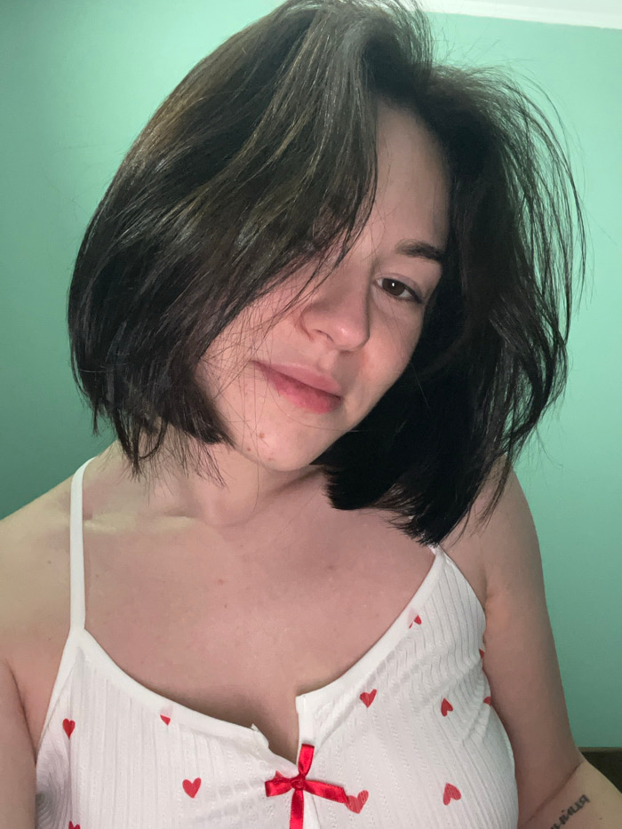 A woman with dark, short hair poses at an angle wearing a white camisole top adorned with red hearts and a red bow. Her skin appears light, and she looks directly at the camera. The background is a so…read more