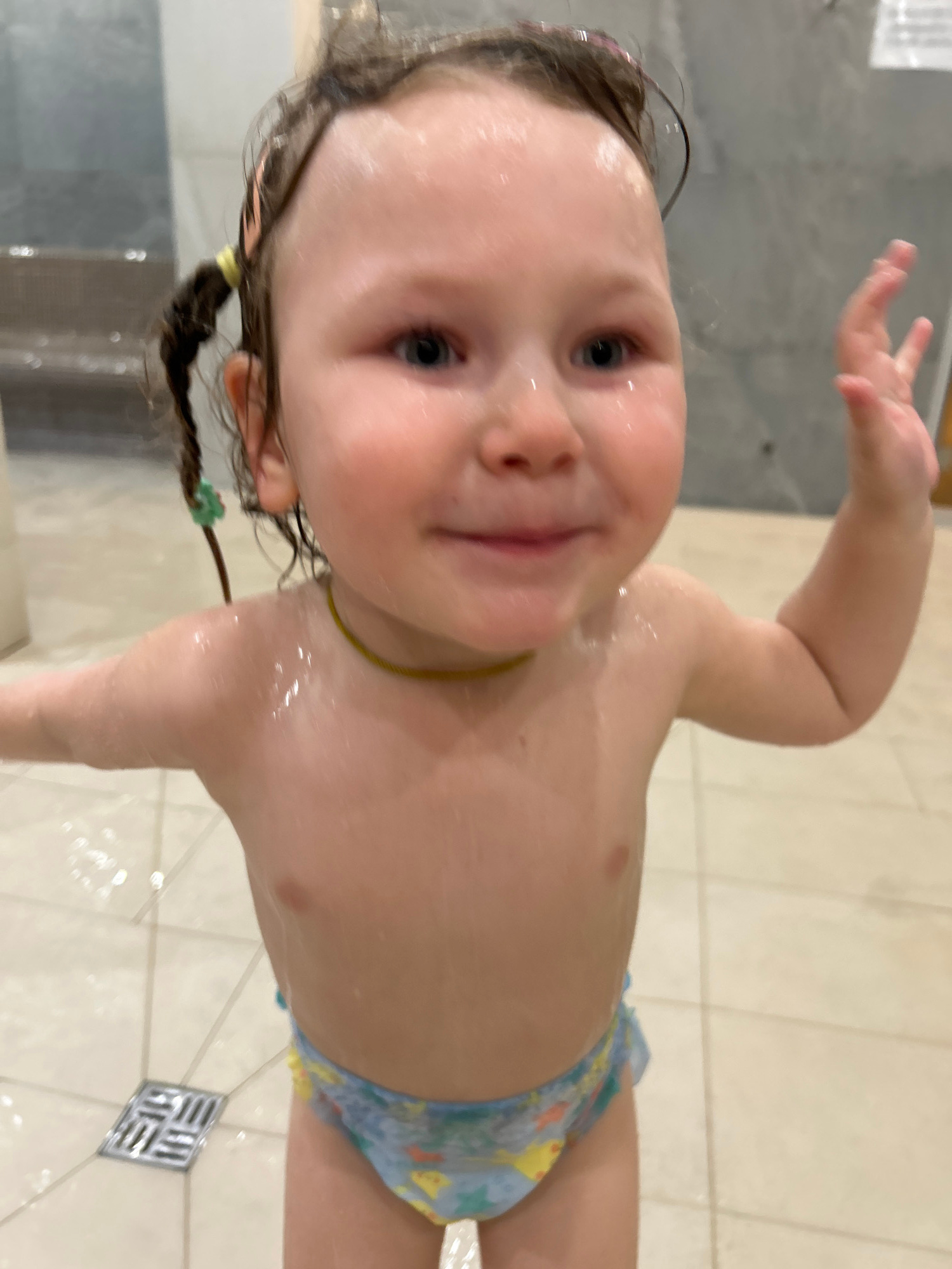 A young child, possibly a toddler, stands in a bathroom. The child is wet and wearing a patterned diaper. The child is fair-skinned with light hair pulled into a small ponytail. One arm is raised, wit…read more