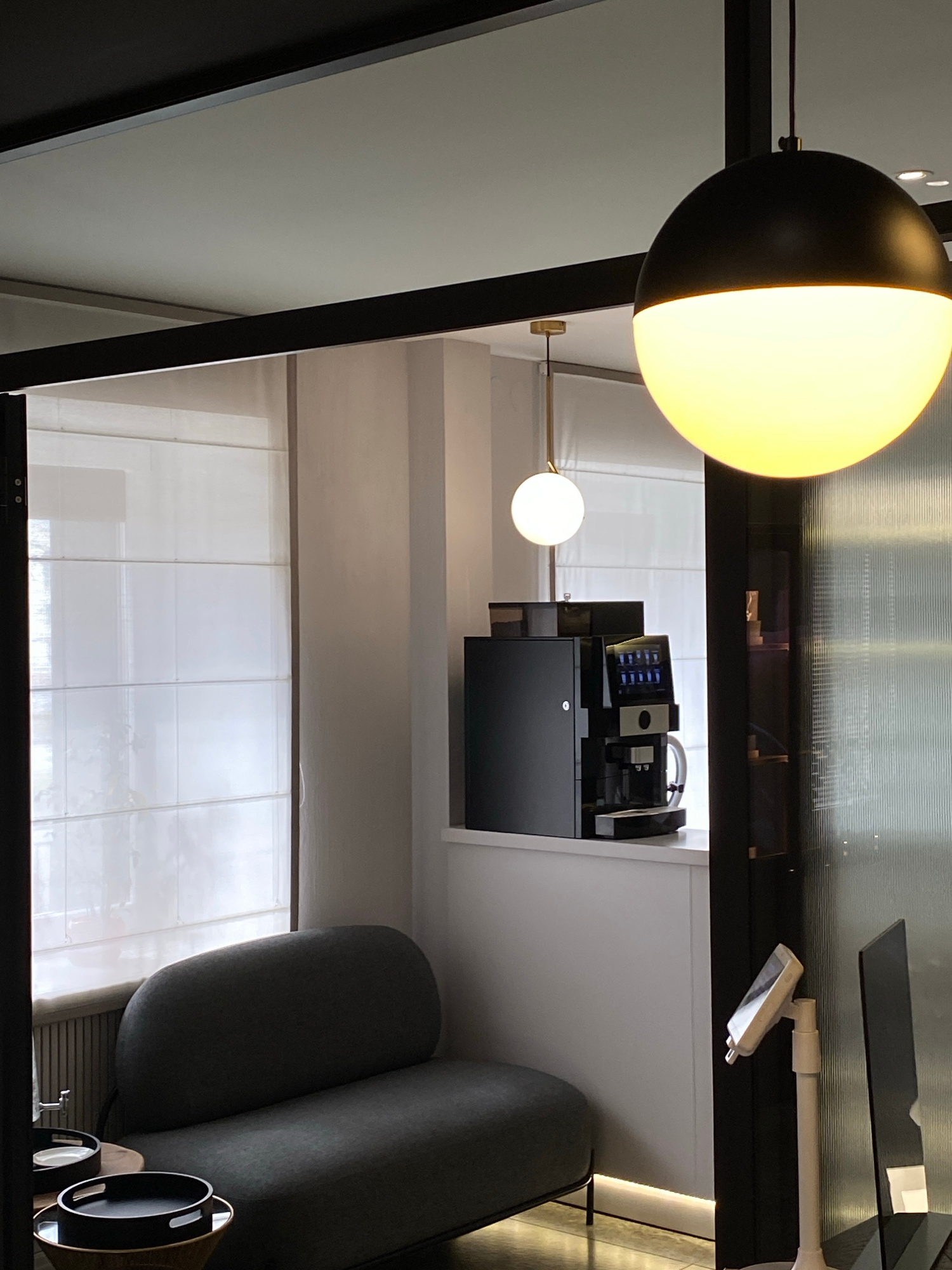 The image shows a room interior with a modern design. Dominating the frame is a spherical pendant lamp with a two-toned color scheme, partially illuminated, adding a contemporary aesthetic. The room a…read more