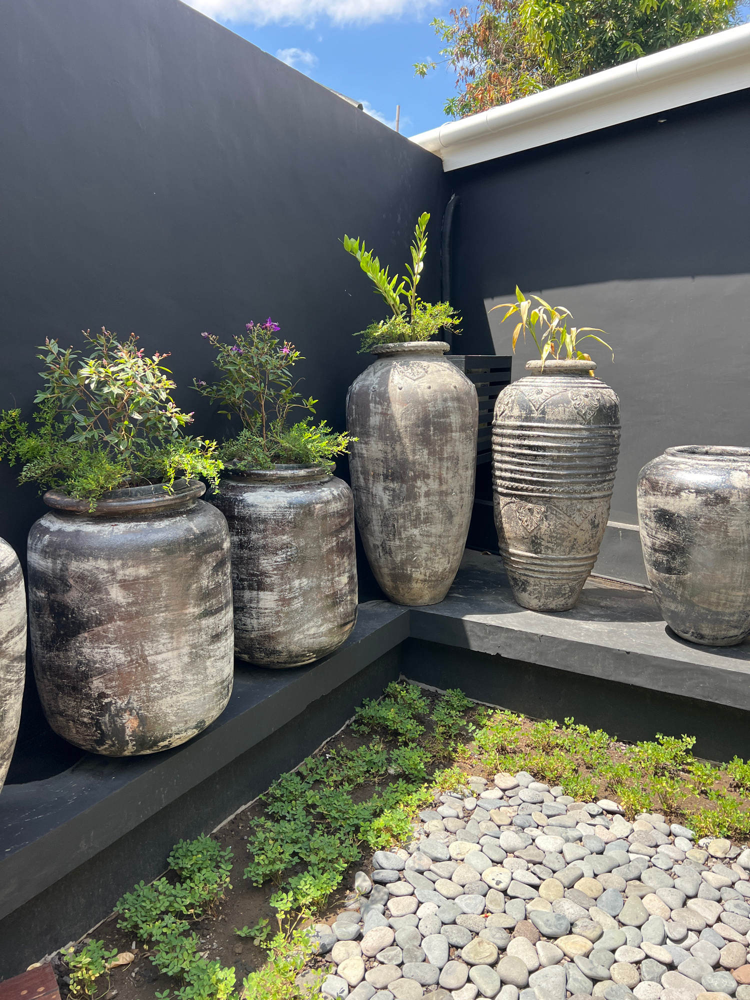 This media file captures an outdoor garden or patio scene, presenting a row of large, rustic pots against a dark wall. The main subjects are six substantial, weathered pots or vases, likely made of c…read more