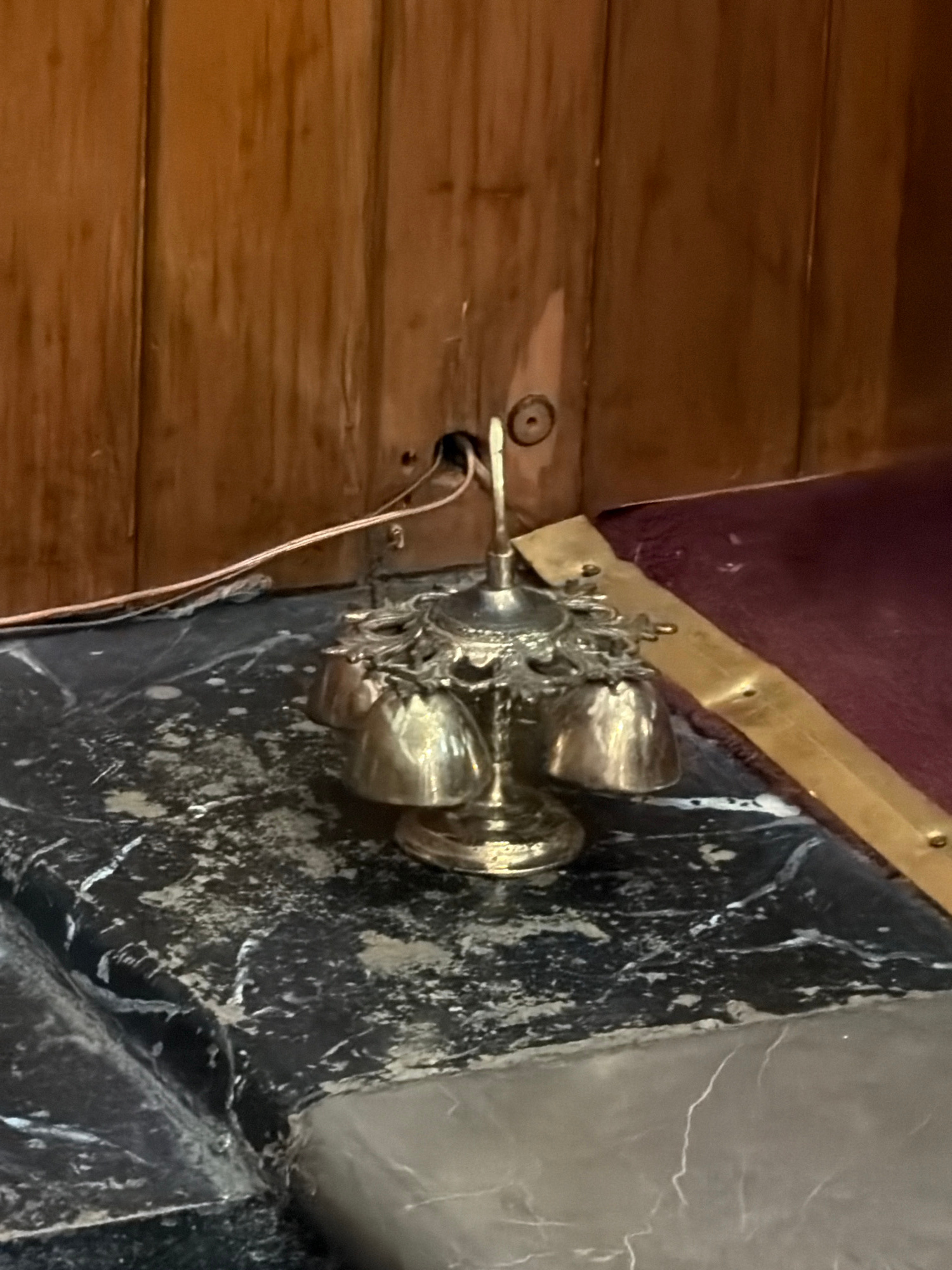 A close-up, somewhat angled shot shows a silver candelabra with several cup-shaped candle holders affixed to a wall with a dark, marbled surface. The candelabra is mounted on the corner where this wal…read more