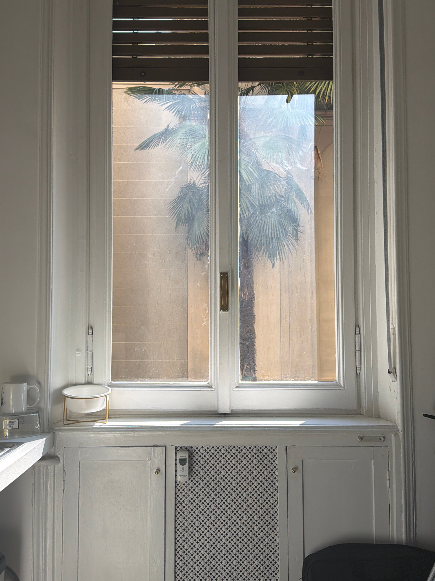 The image depicts a static interior view of a room looking out through a white-framed double window onto an outdoor area in Milan, Italy. The window features two vertical panes, each with a single bra…read more