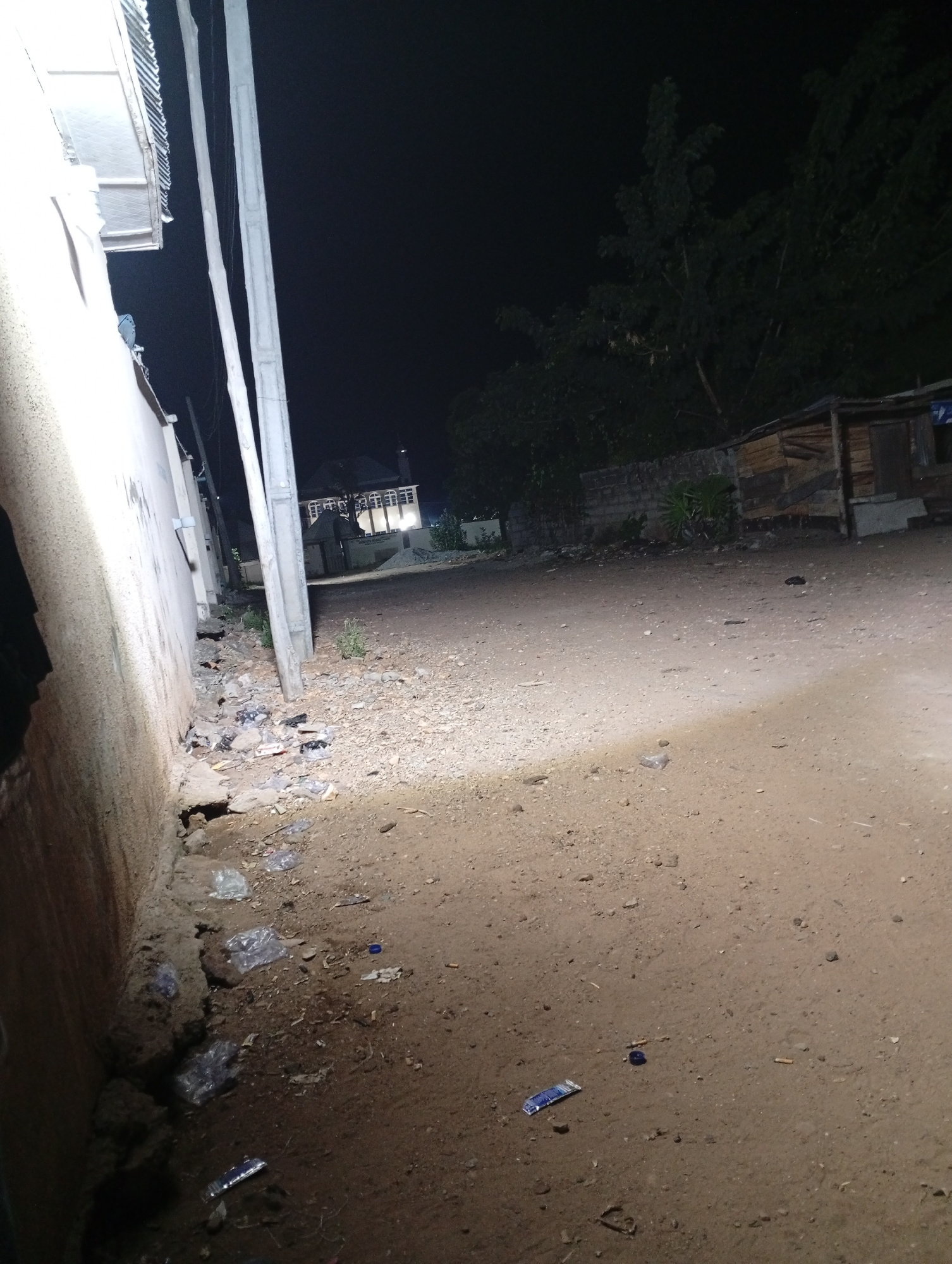 Adankolo, Nigeria. Night. A dirt road illuminated by a light source (likely a streetlight or vehicle headlights) runs away from the viewer. The left side of the road is bordered by a wall and severalβ¦read more