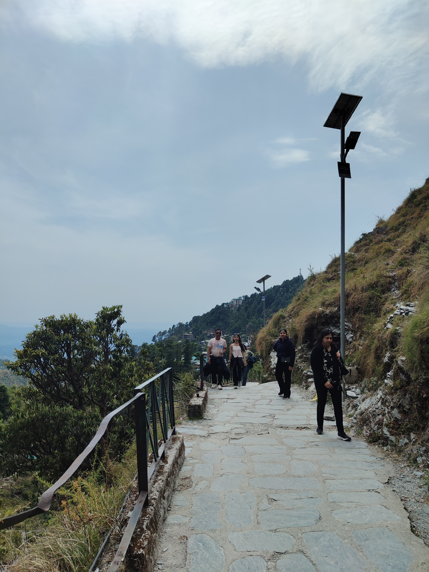 The image captures a group of people walking uphill on a winding, stone-paved path in a mountainous region, likely Bhagsu, India. In the foreground and midground, several individuals are visible, incl…read more