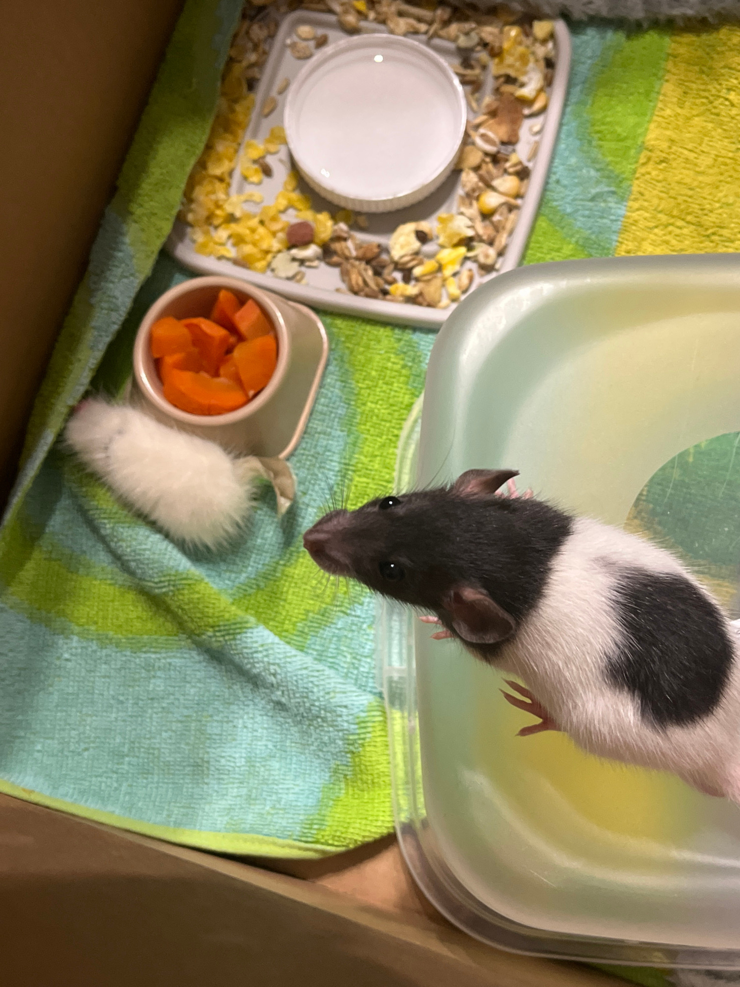 A black and white rat leans out of a clear plastic container towards a green and yellow striped cloth. Next to the rat are a metal dish with sliced carrots and a white fuzzy toy. There is a dish with…read more