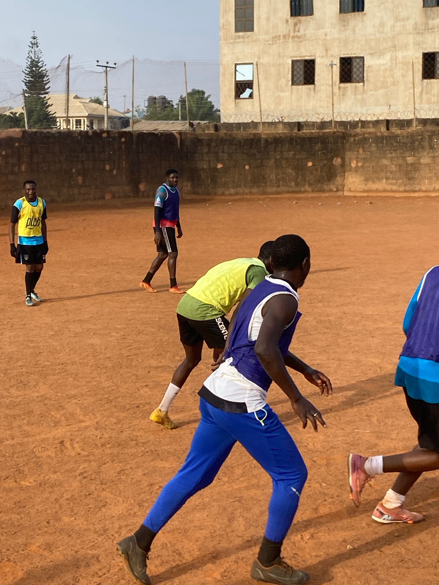 This image captures an outdoor scene in Barakin Lerawi, Nigeria, showing several young men engaged in athletic activity on a reddish-brown dirt field. The lighting suggests either early morning or lat…read more