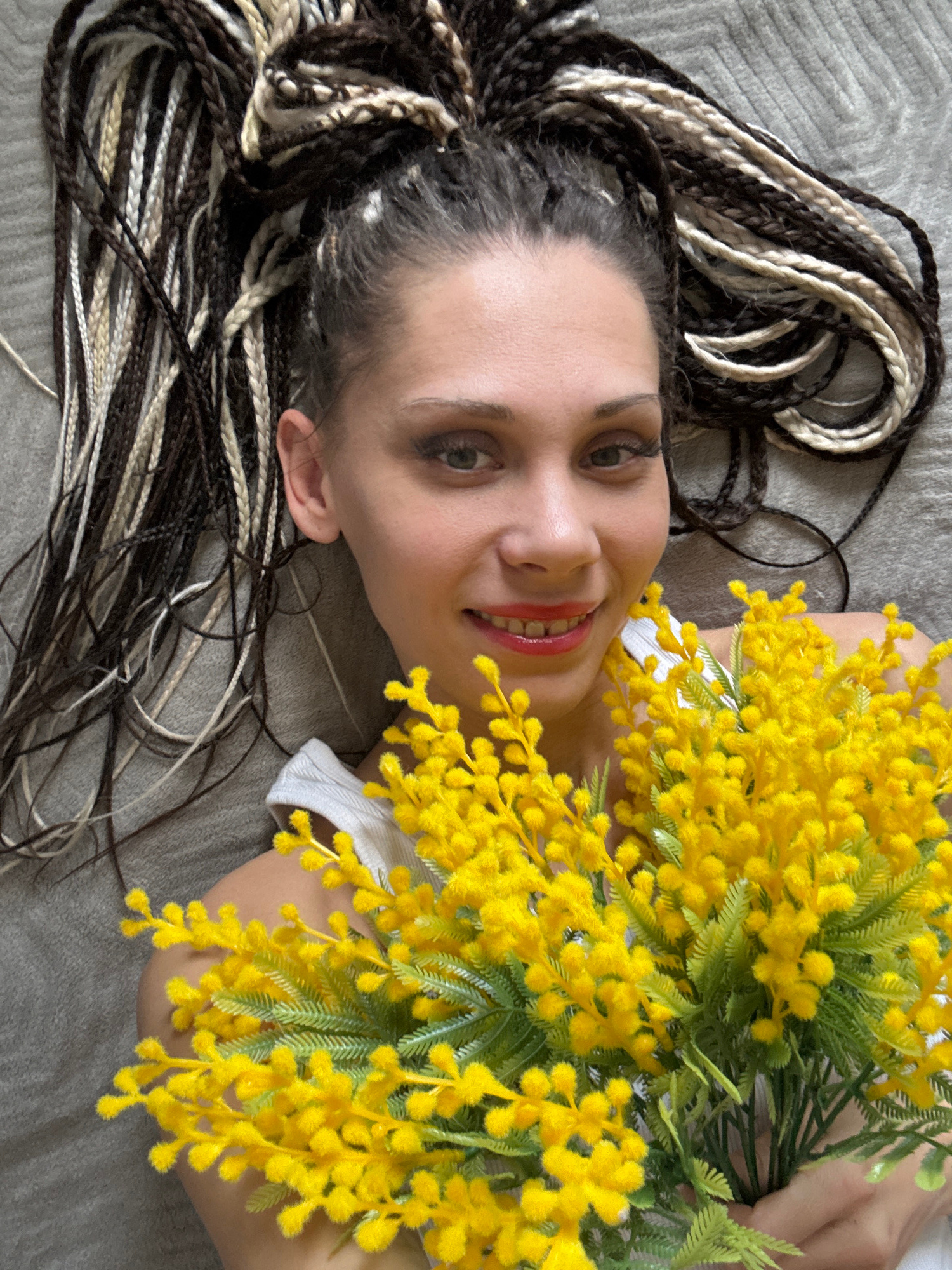 A woman lies on a gray surface in an unknown location in the city of Unknown, Unknown. She has brown and blonde braids. She is smiling and holding a large bouquet of yellow flowers. She is wearing a w…read more