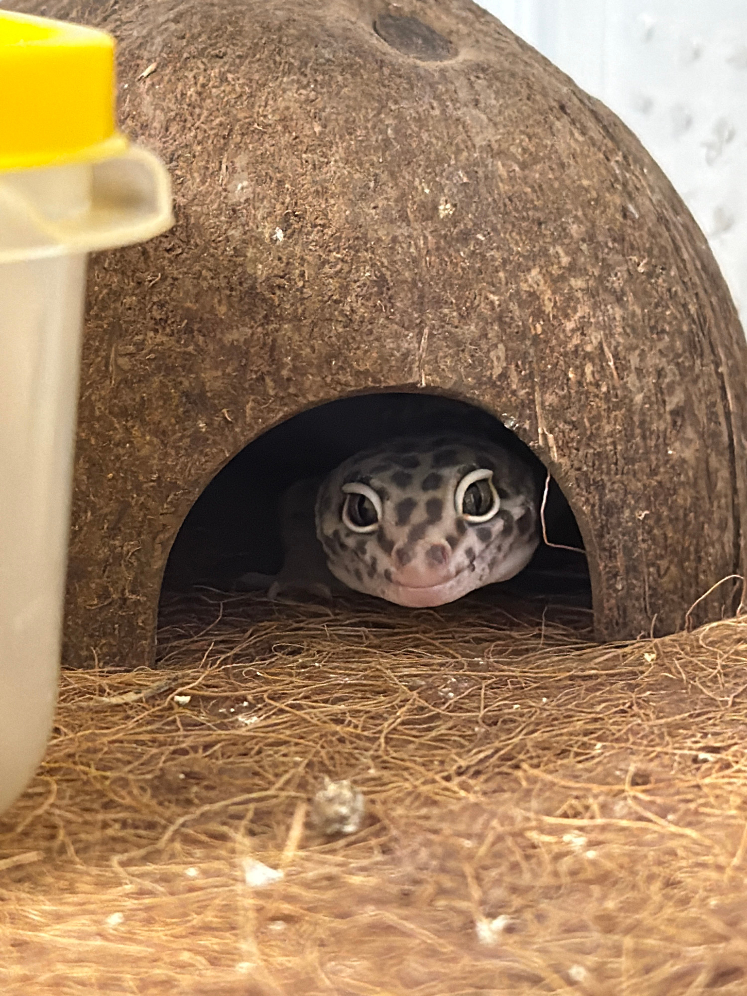 A leopard gecko peers out of a circular opening in a coconut shell hide. The hide is mounted on what appears to be a textured, fibrous material, possibly coconut coir or similar substrate. The gecko's…read more