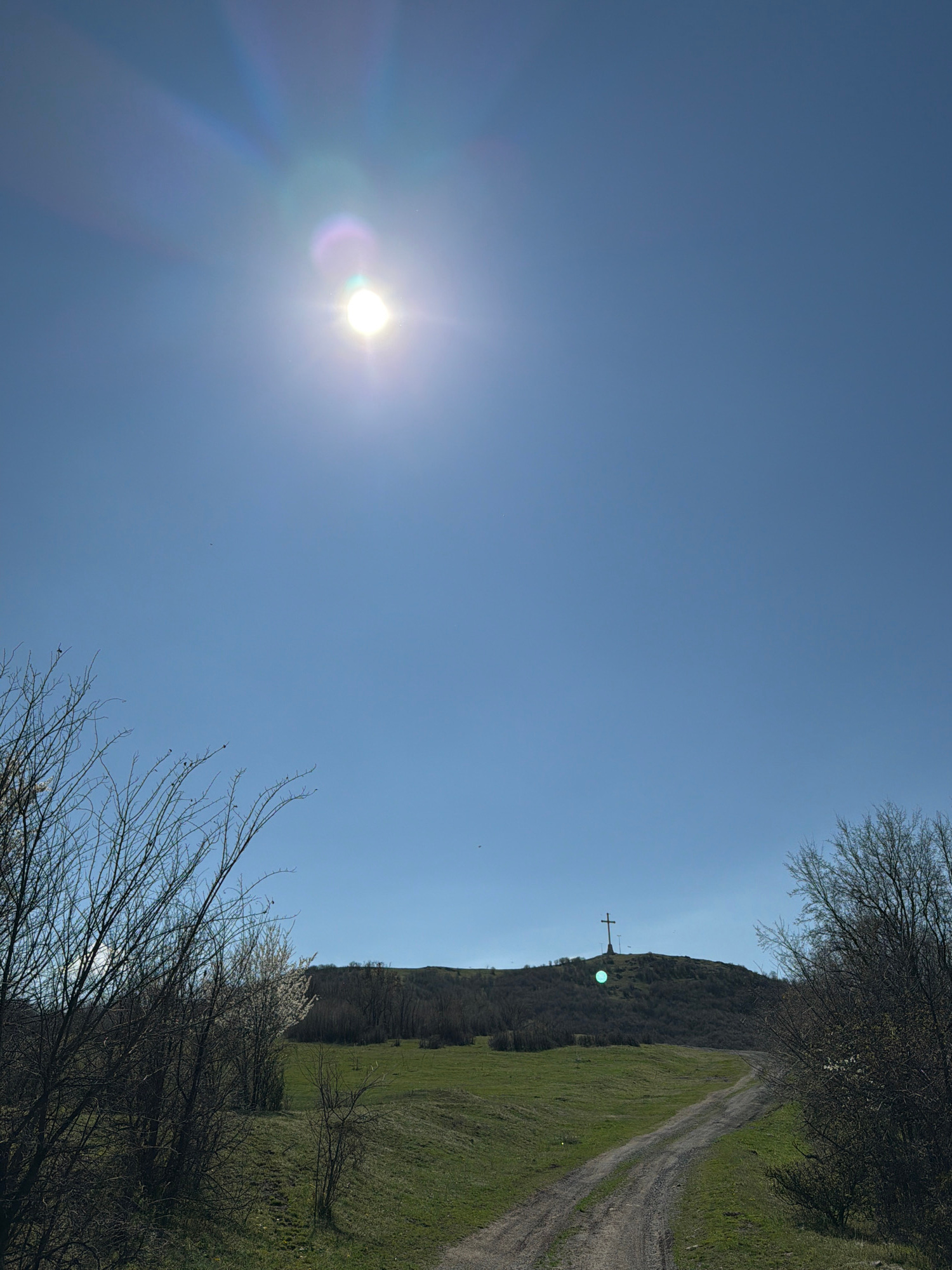 The image depicts a landscape in Bata, Bulgaria on a sunny day. The sun is visible in the left portion of the sky, accompanied by lens flares. To the right, a dirt road ascends a grassy hillside. A cr…read more