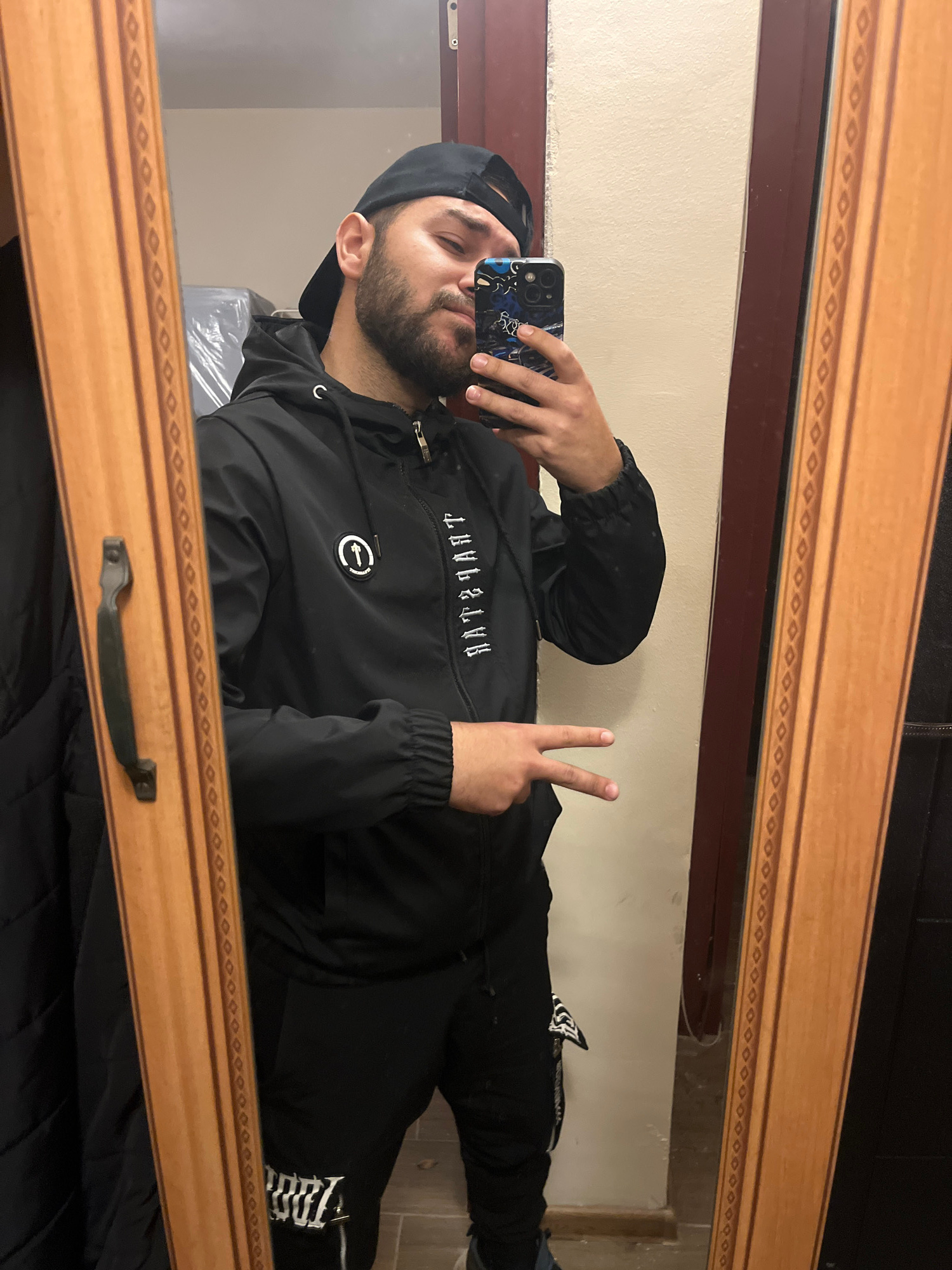 A man wearing a black baseball cap, black jacket, and black pants is taking a mirror selfie. He is holding a smartphone in his right hand, with the camera facing the mirror. He is making a peace sign with his left hand. The mirror has a light brown wooden frame with a decorative pattern. The background appears to be a room with light-colored walls. The location is not discernible from the image. | Open Wire