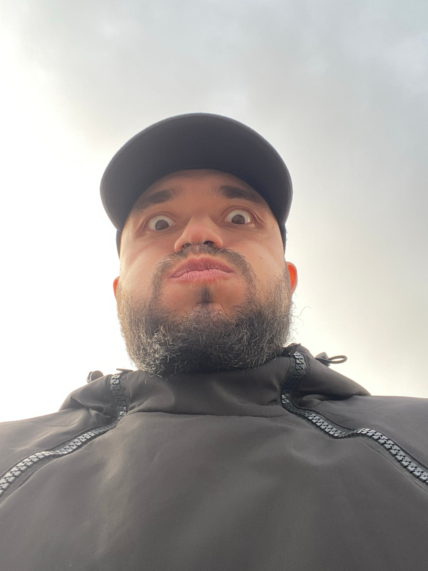 The image displays a close-up, low-angle portrait of a man, rotated 90 degrees clockwise. When viewed upright, the man's face dominates the upper portion of the frame, looking down towards the cameraβ¦read more