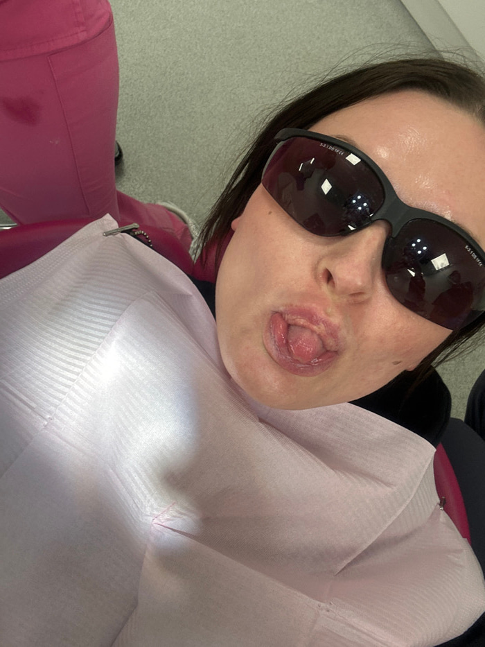 The image shows a person wearing dark-tinted safety glasses and a disposable bib, suggesting a dental or medical appointment. The person sticks their tongue out, displaying visible lingual frenulum. T…read more