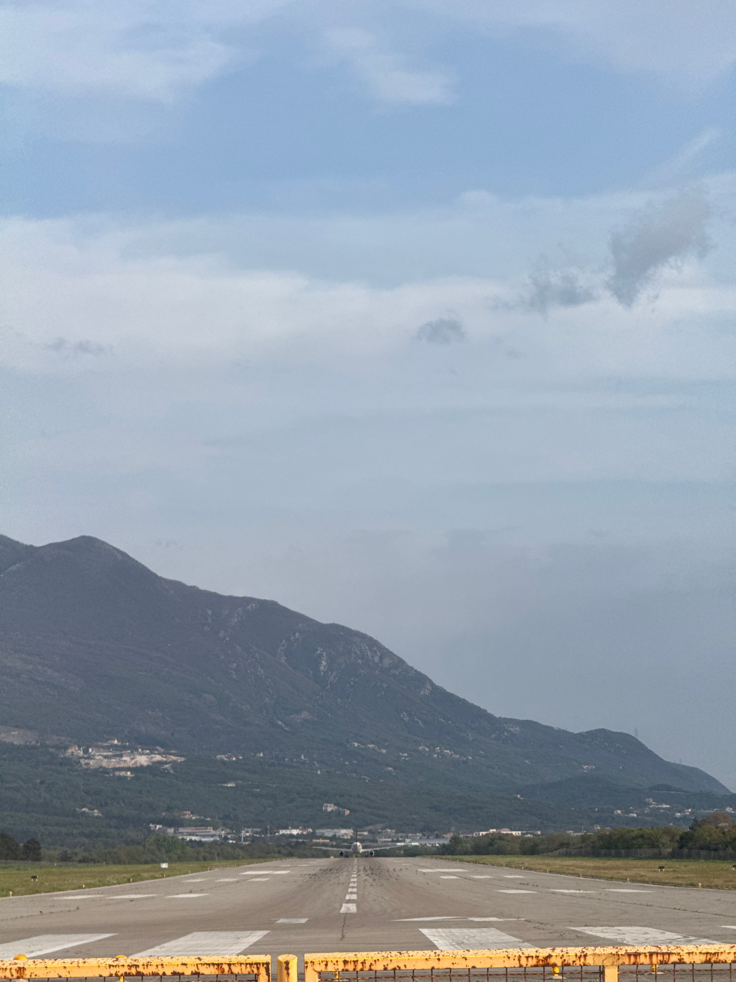 The image shows a view of Tivat Airport in Mrčevac, Montenegro. A runway stretches into the distance, bordered on one side by a hillside covered in trees and buildings. The other side of the runway ha…read more