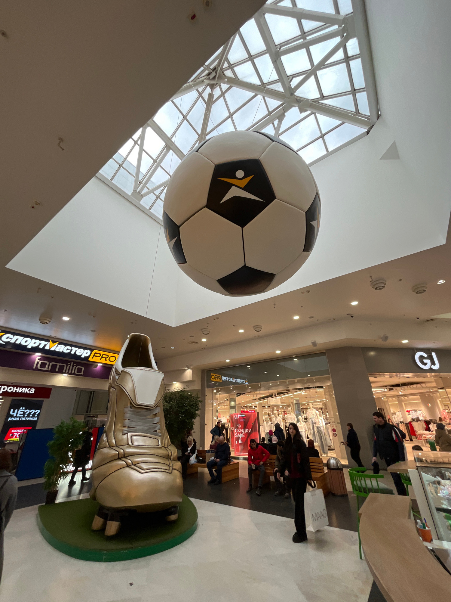 The image is taken from inside a shopping center in Krasnoyarsk, Russia. A large soccer ball is suspended from the ceiling near a windowed skylight. Below the soccer ball, a large golden soccer shoe s…read more
