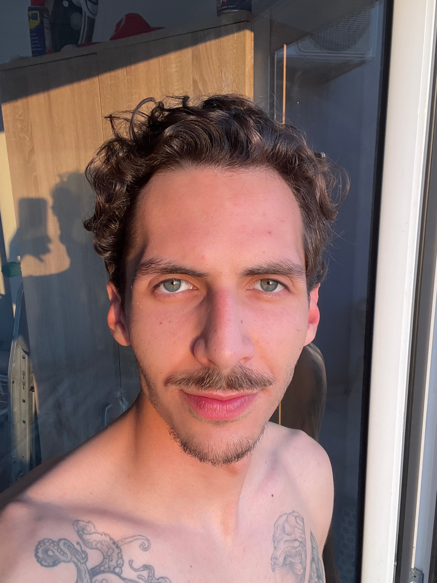 A close-up, angled shot shows a shirtless man with curly brown hair, hazel eyes, and a light mustache. He is looking directly at the camera. Parts of tattoos are visible on his right shoulder and ches…read more