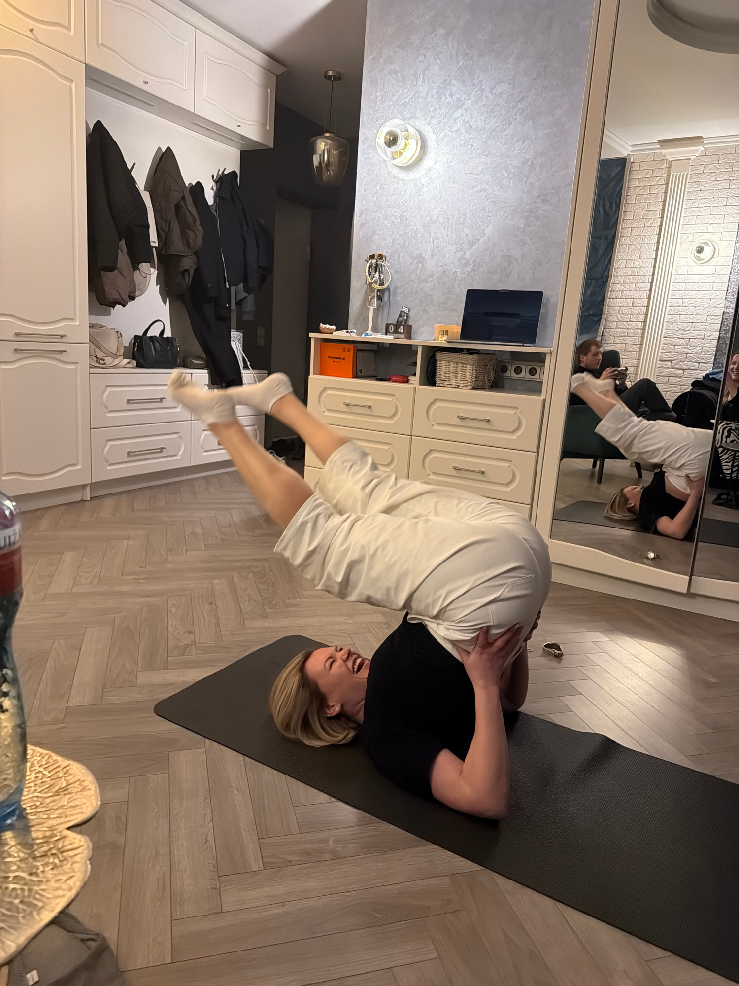 A woman is performing a yoga headstand on a gray yoga mat in what appears to be a home interior. She is wearing a black top and white cropped pants, with white socks on her feet. The room features whi…read more