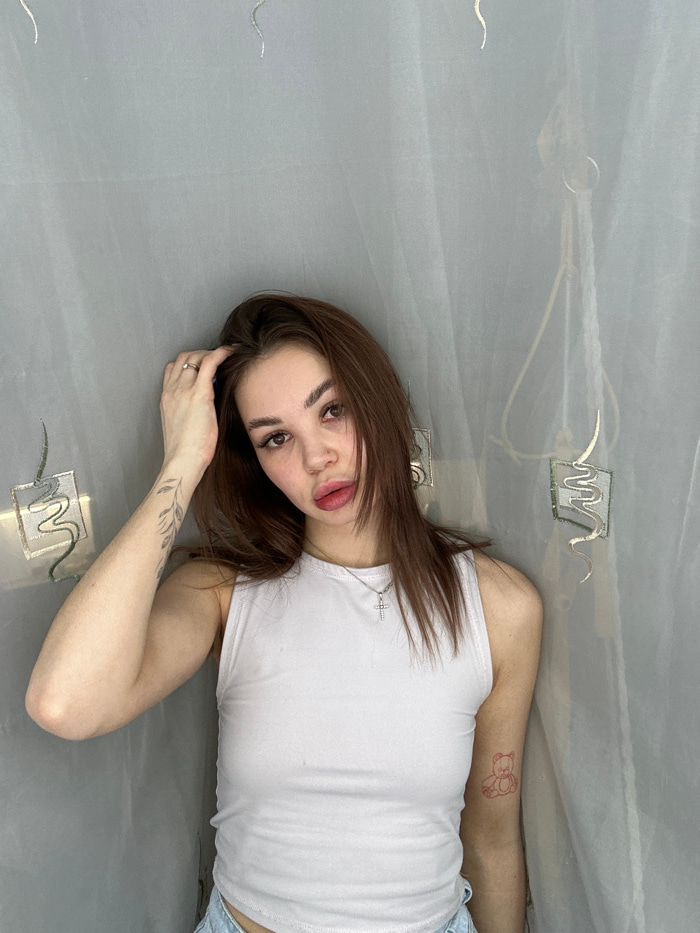 The image displays a young adult female positioned indoors against a light grey, translucent curtain backdrop that features subtle, abstract, lighter-colored patterns. The subject has long, straight b…read more
